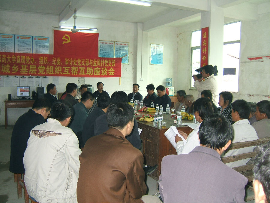 在盘凤村村委会办公室,直属党办、组织、纪委(监察处)党支部与盘凤村党支部共同召开组织生活会。黄斌书记率先表明了我们此行的目的;之后组织部古展群部长又向大家介绍了省委对于我们开展"互帮互助"工作的要求和意义;在党办洪创雄副主任的带领下两个支部认真学习了十七届三中全会关于农村改革和建设的最新知识。大家围绕农村的教育、医疗和卫生体系的改革等农村热点话题展开了激烈的讨论。讨论结束后组织部古展群部长把《推进农村改革发展的伟大纲领》送给了盘凤村党支部以便他们可以更好的体会最新的政策。最后在欢快祥和的气氛中结束了此次支部生活。
