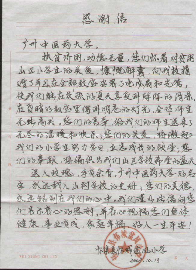 盘凤小学作为我们的主要帮扶地点之一,我们又进行了慰问,看到上次花4000多元捐助的灯管、风扇已经派上了用处,基本解决了同学们夏天上课炎热和光线暗的困难。老师同学们为了表达他们的谢意亲自写了感谢信送给我们;之后为盘凤小学捐赠了学习用品和图书,又对一名品学兼优的贫困同学给予了一定的经济资助,黄斌书记亲切的和小同学进行了交流,鼓励她好好学习,将来做一个有利于社会的人。