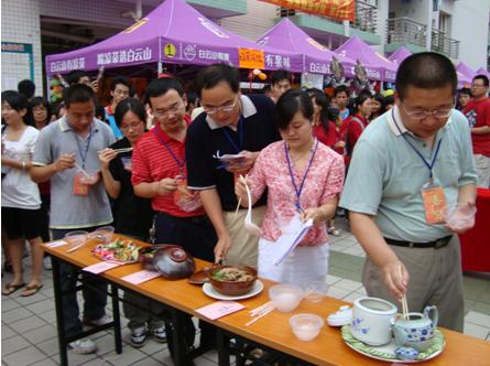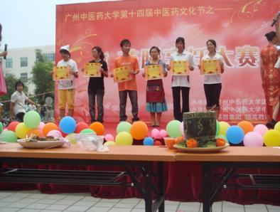 各参赛队伍都为自己的队伍和菜式起了好听的名字,并使出浑身解数进行现场烹饪和推销。他们的摊位前围满了前来观看和品尝的同学。现场气氛非常热烈。难能可贵的是,许多学生能将中医药知识同饮食文化巧妙第结合起来,自觉地发明了很多新的菜式。如二院的"伊人凤彩粥"、中药学院"醉打金鸡"、护理学院"金汁玉液"等以李政木教授为首的评判团的认真评审,由中药营销专业学生组成的"法兰西鸭师奶"队凭借"醇酱酒暖鸭先知"夺得冠军,中药学专业的"尽膳尽美队"凭"月落乌啼霜满天"获第二名,信息科技学院"蒸膳美厨阁"队凭"金童玉女"获第三名。另外还评出了最具药膳价值奖,最具诱惑菜式奖,最具团体精神奖和四个优秀奖。这次"药膳烹饪大赛"活动对于在学生中推广源远流长的中药药膳文化起到了积极作用。(团委供稿)