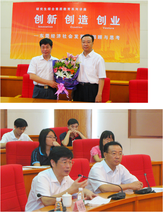 讲座由大学校长徐志伟教授主持,在大学城校区办公楼圆型会议室举行,近180名研究生聆听了刘主席的精彩演讲。刘主席从发展概况、发展背景、以及发展的理念与对策三个方面详细阐述了东莞三十年取得的辉煌成就与宝贵经验。结合自已在东莞三十余年的工作经历,刘主席认为东莞之所以能够从一个改革开放前的贫困县发展至今天的国际都市,其跨越式发展是在积极把握天时"国际资本大循环"、地利"优越的地理位置"、人和"国家改革开放政策"等有利条件,发挥东莞人吃苦耐劳、踏实肯干、敢为人先的精神而获得的。结合现阶段我国经济社会发展的特点,刘主席还系统阐述了现代社会、企业对人才素质、能力的要求,并对研究生提出了自我培养的具体建议。