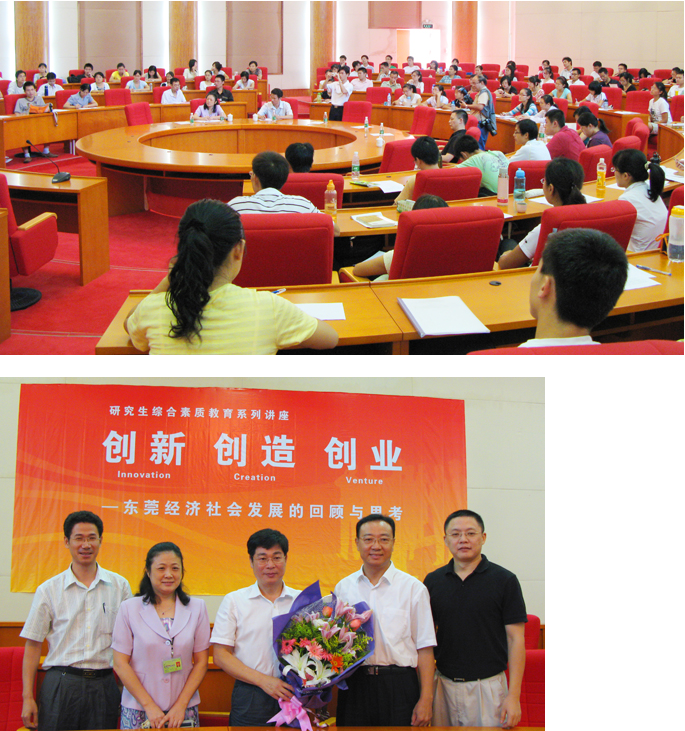为进一步加强研究生素质教育,加深研究生对社会的认知与了解,时值我国改革开放三十年之际,应研究生院邀请,2008年10月14日下午3时,东莞市政协主席刘树基同志莅临beat365官网指导工作,并结合东莞改革开放三十年来的成就与经验,为beat365官网的研究生做了题为"创新、创造、创业——东莞经济社会发展的回顾与思考"的精彩演讲,在研究生中引起强烈反响。