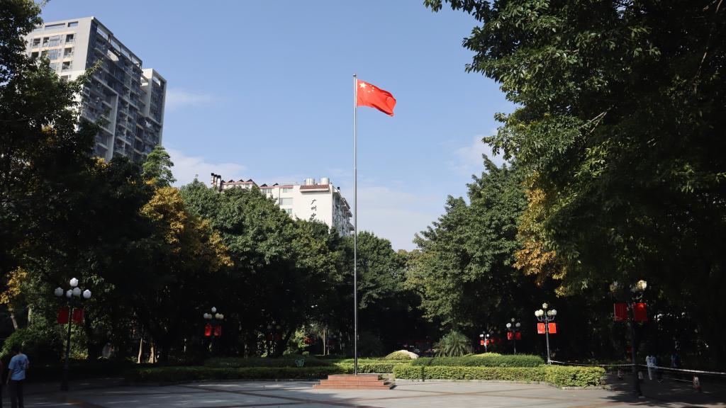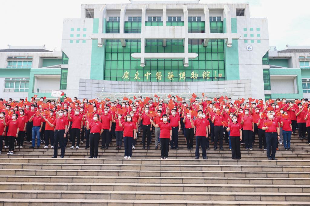 全体师生注目冉冉升起的五星红旗,齐声高唱《义勇军进行曲》,将诚挚的祝福献给党和祖国。鲜艳的五星红旗拥抱晨曦,迎风飘扬在广中医的上空。