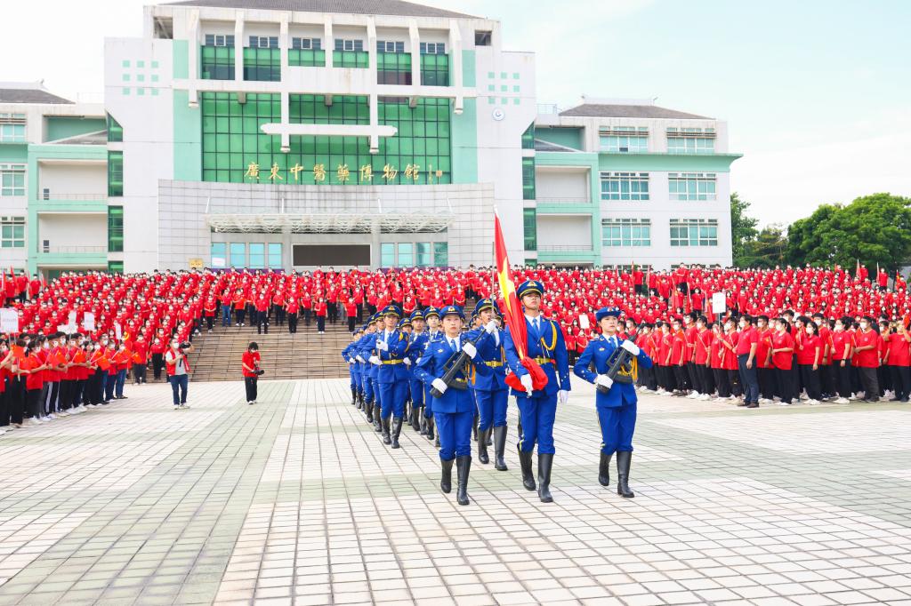 “厚德博学,精诚济世,同心写春秋……”升旗仪式结束,雄浑有力的校歌缓缓响起。师生挥舞手中的五星红旗,齐唱校歌,用歌声承载师生的爱国情谊,传递杏林精神。