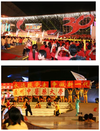 5月4日晚上,由共青团广东省委、共青团广州市委、广东省青年联合会、港澳青年联合会、广东省音乐家协会、广东省流行音乐协会等联合举办的"《青春万岁》•粤港澳青年纪念改革开放三十周年"大型歌会在广州大学城体育馆隆重举行。beat365官网党委孙晓生副书记出席了晚会,学校团委选派了合唱、舞蹈、武术类共500多名同学参加这次歌会的演出,组织600多名同学现场观看了表演。