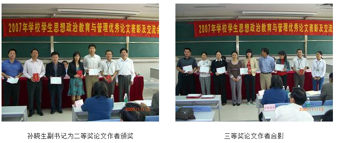 会议由学生处林彬处长主持。会议首先由学校党委孙晓生副书记宣读《关于表彰2007年beat365英国官网网站学生思想政治教育与管理优秀论文的决定》。本次参评论文共45篇,主要涉及大学生思想政治教育与管理的理论与应用研究,经过七位校内专家的评审,最终评出一等奖3篇,二等奖6篇,三等奖10篇。会上,各级领导分别给获奖作者颁奖并由获得一等奖的作者在会上进行了大会交流。随后由马定科校长助理代表评审专家组,对参评文章进行了细致的点评。马助理从本届参评论文的质量、论文的研究范畴以及论文的文笔功底等方面进行了点评,使论文作者清楚地了解了文章所存在的不足和撰写文章的基本要领。大会最后由党委黄斌书记和孙晓生副书记作总结讲话。黄书记在总结中强调我们思政工作者首先要提高认识,统一思想,切实把加强辅导员队伍建设这项政治任务抓实抓好;其次要立足当前,着眼长远,健全辅导员队伍建设的领导管理体制、工作机制和政策保障机制;要建立学院党政"一把手"领导责任制,把辅导员队伍建设状况作为评估考核学院工作的重要指标,作为学院领导干部业绩考核的重要内容;要健全辅导员选聘、培养、发展、管理机制,鼓励优秀辅导员攻读思想政治教育硕、博士学位,加强培训,促进辅导员骨干队伍向职业化、专家化方向发展,畅通辅导员流动渠道,既吸收优秀人才从事辅导员工作,又积极向其他岗位推荐、输送辅导员,搭建辅导员队伍发展的"立交桥";同时指出,要牢记责任,不辱使命,不断提高辅导员工作水平,以社会主义核心价值体系为根本和导向,组织和指导学生开展多种形式的思想政治教育活动;最后他希望辅导员队伍能不断提高思想政治素质、不断提高专业技能、严格遵守组织纪律、培养良好工作作风,以马克思毛泽东思想、邓小平理论、"三个代表"重要思想为指导,全面贯彻落实科学发展观,为加强和改进大学生思想政治教育,促进高等教育事业持续健康发展,为学校的建设作出新的更大贡献。孙书记的讲话中对此次参评论文的质量作出了肯定,并希望能有更多的思政工作者、行政管理者能参与到其中,真正实现大学生思想政治教育的全员参与;另外他还指出,beat365官网思政工作者的课题研究要注意立足现实问题,减少战略层面的模糊理论研究,增强战术层面的实用应用研究,为把beat365官网思政工作推向一个新的高度而不懈努力。