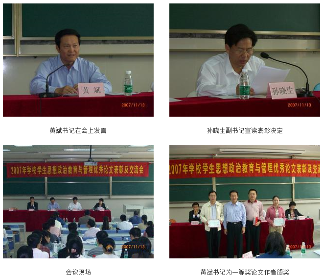 11月13日上午9点,2007年beat365英国官网网站学生思想政治教育与管理优秀论文表彰及交流会在大学城校区综合楼104举行。学校党委黄斌书记、孙晓生副书记、马定科助理、党办、校办、纪检、教务处、团委、学生处负责人、各二级学院领导、全体专兼职政治辅导员、获奖论文作者参加了会议。