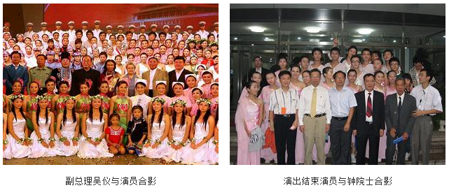 演出结束后,吴仪副总理走上舞台,同演职人员亲切握手,鼓励全国卫生系统干部职工以饱满的热情、高尚的医德医风和精湛的医术为人民健康服务、为社会主义现代化建设服务。