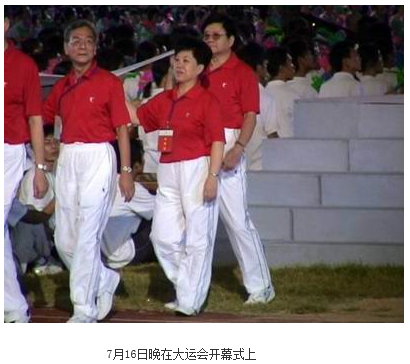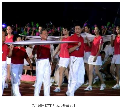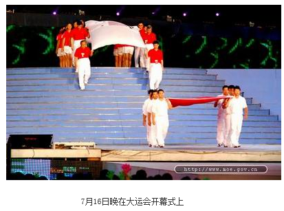 庄重的升旗仪式后,出现在体育场舞台中心的是三个举旗方阵,第一个是由前广东世界冠军们举的国旗方阵,第二个是由广东的院士、全国名师举的会旗方阵,第三个是由女大学生举的第八届大运会旗方阵。