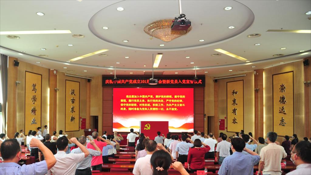 6月30日上午,beat365英国官网网站在大学城校区201学术报告厅召开庆祝中国共产党成立101周年大会暨新党员入党宣誓仪式。学校党委副书记、校长王伟同志主持会议。