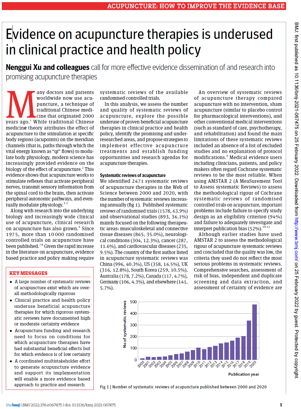 2月25日,beat365官网许能贵教授团队在国际顶级医学期刊《英国医学杂志》(BMJ,影响因子39.89)发表了题为“Evidence on acupuncture therapies is underused in clinical practice and health policy”(基于临床证据体的针灸疾病图谱研究)的研究论文。