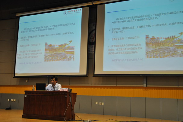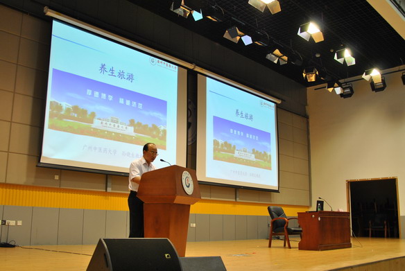 孙晓生教授首先从广东优势传统产业——旅游业的发展讲起,结合我国传统的养生学说,提倡旅游与中医中药、养生相结合,通过旅游活动来调畅气血、和悦情志、锻炼体魄,以达到健身防病、延年益寿的目的。同时他还结合广东现有的一些中医中药基地与旅游路线的开发,提倡养生旅游的开发。之后孙书记又以风趣的语言给同学们介绍了一些旅游景点的养生方法与作用以及一些药材的食疗方法。讲座的最后,孙教授对养生旅游的前景作了分析,鼓励同学们结合自己专业知识参与研究。