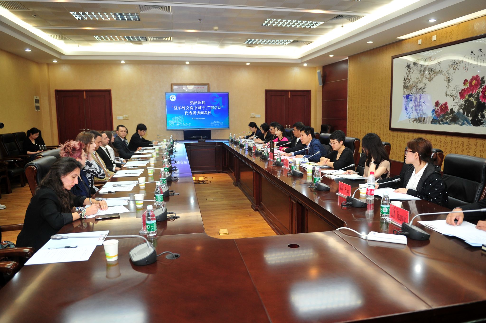 5月11日下午,校长王伟在大学城校区会见了由来自法国、瑞士、匈牙利、北马其顿、阿尔巴尼亚、摩尔多瓦等欧洲国家驻华使领馆官员组成的“驻华外交官中国行—广东活动”代表团。学校党委副书记邱亚洪主持座谈会。