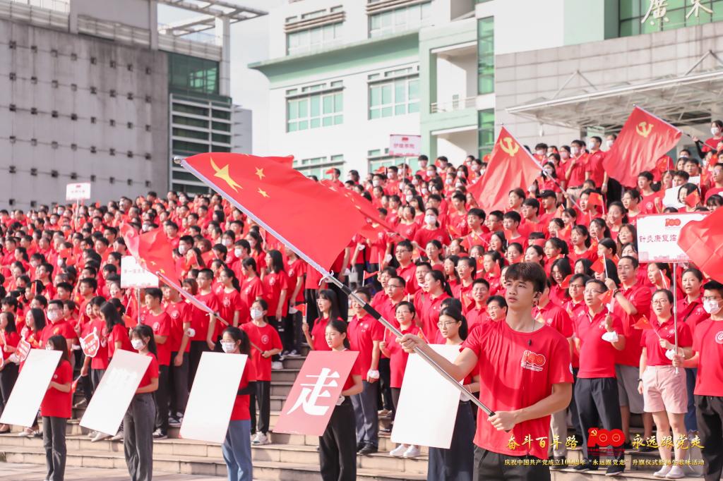 7月1日清晨,校园里红旗招展、歌声激昂,2600名师生井然有序地在学校国旗广场上,举行“永远跟党走”升旗仪式暨师生歌咏活动,以饱满的爱党爱国热情庆祝中国共产党成立100周年。