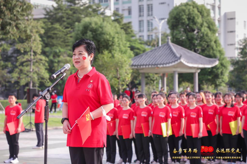 五星红旗下,学校党委书记张建华发表讲话,她表示我们党100年的历史是一部奋斗的历史、光辉的历史、催人奋进的历史,我们要用党的奋斗历程和伟大成就鼓舞斗志、指引方向,用党的光荣传统和优良作风坚定信念、凝聚力量,用党的历史经验和实践创造启迪智慧、砥砺品格,我们要继往开来、赓续红色血脉,沿着革命先烈的足迹前进。她鼓励老师们向“七一勋章”获得者、优秀教师张桂梅学习,争做“四有”好老师,培养更多更好的优秀中医药人才;她鼓励同学们听党话、跟党走,掌握好为人民服务的本领,为中华民族的伟大复兴事业添砖加瓦,贡献青春力量。