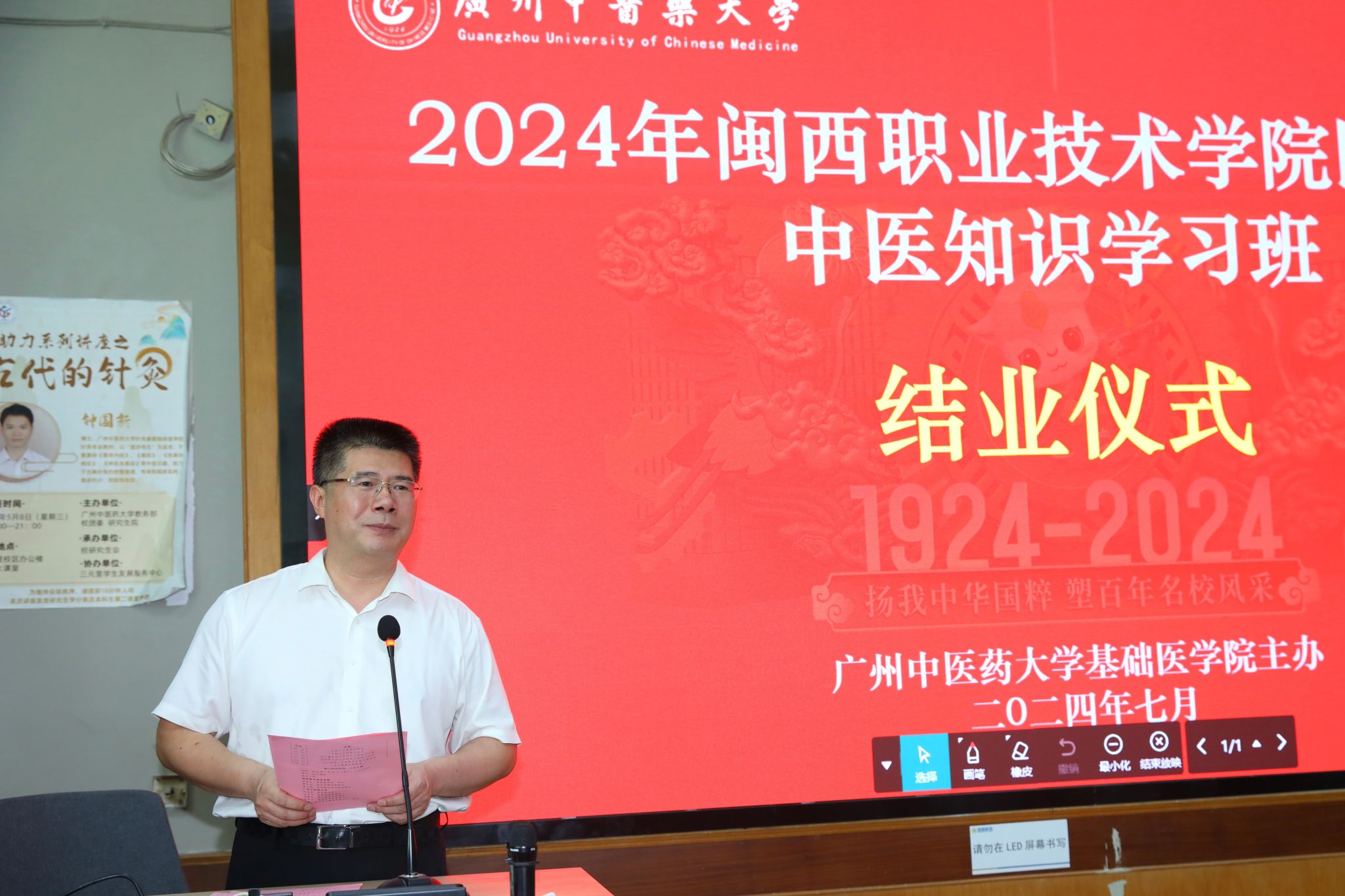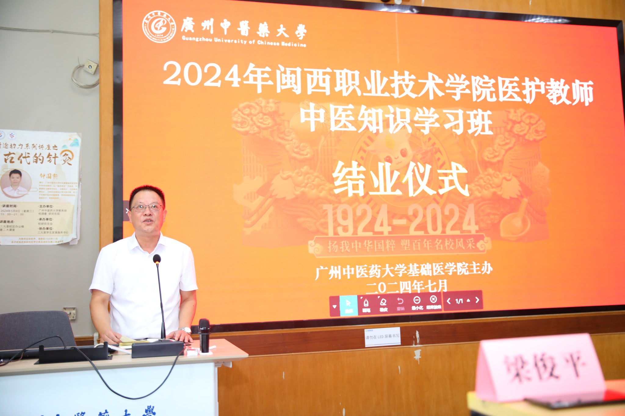 7月16—20日,2024年闽西职业技术学院医护教师中医知识学习班在beat365官网三元里校区顺利举办。本次学习班由beat365英国官网网站基础医学院主办,继续教育学院、发展规划部协办。学校党委书记陈文锋,闽西职业技术学院党委副书记、校长梁俊平等出席结业仪式,学校党委副书记邱亚洪主持结业仪式。副校长刘中秋,闽西职业技术学院副校长刘路永出席开班仪式。