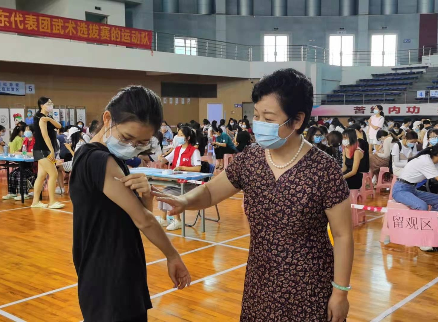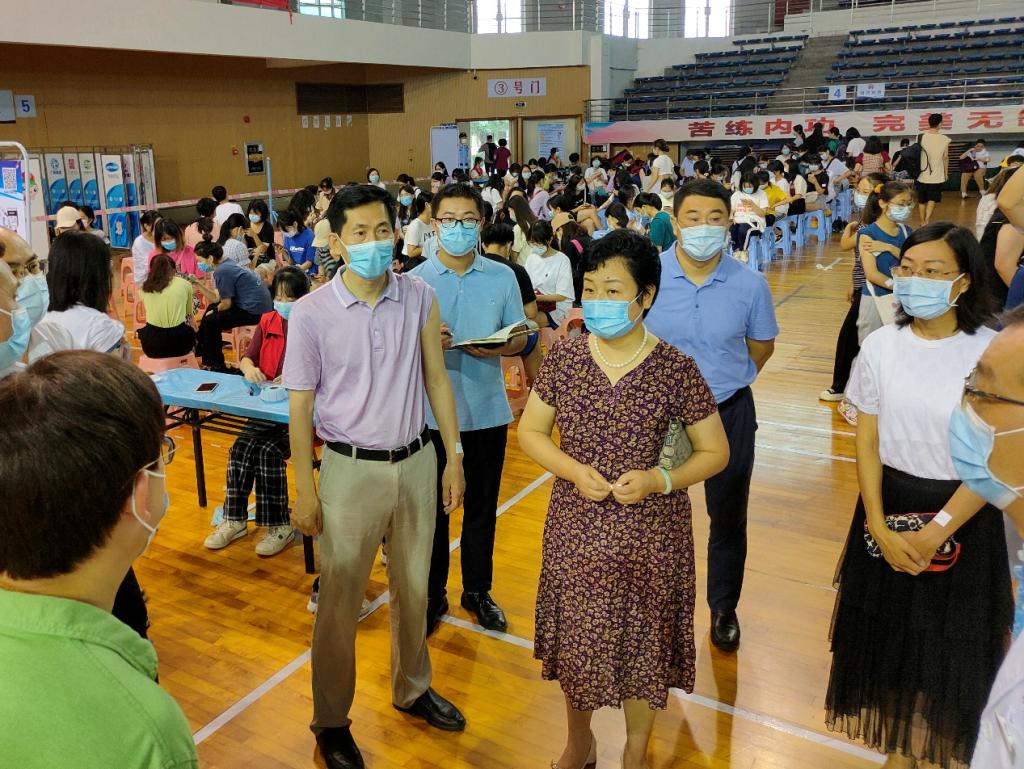 2021年5月23日上午,学校党委书记张建华,党委副书记、校长王伟,副校长刘中秋、郭鸿等学校领导到学校体育馆疫苗接种现场检查指导疫情防控工作。