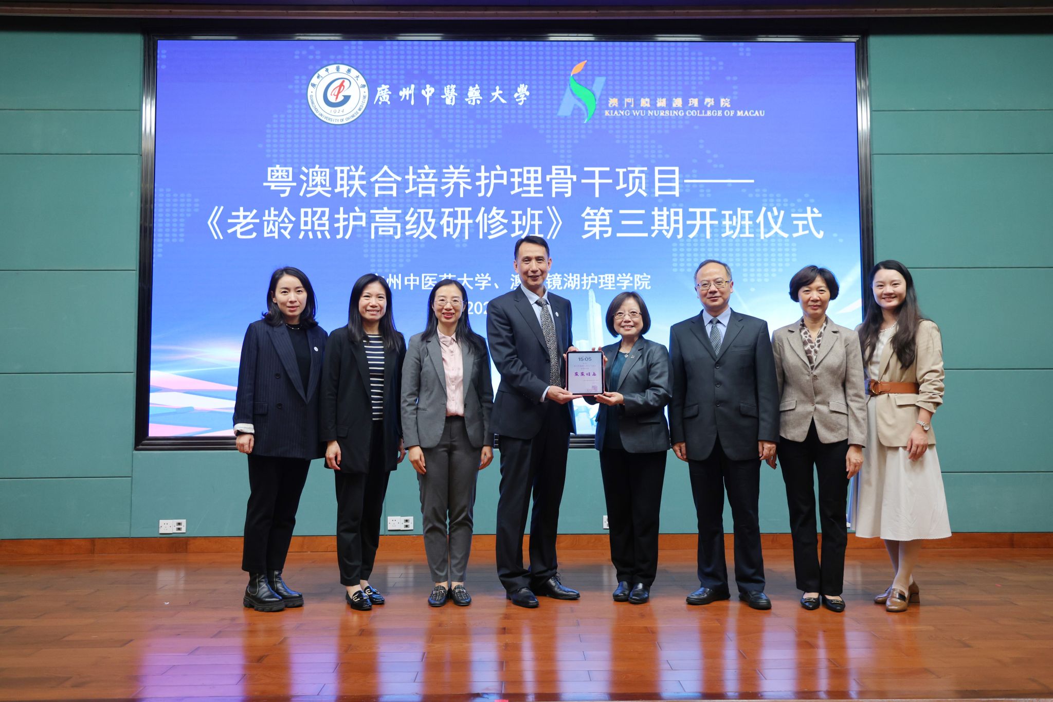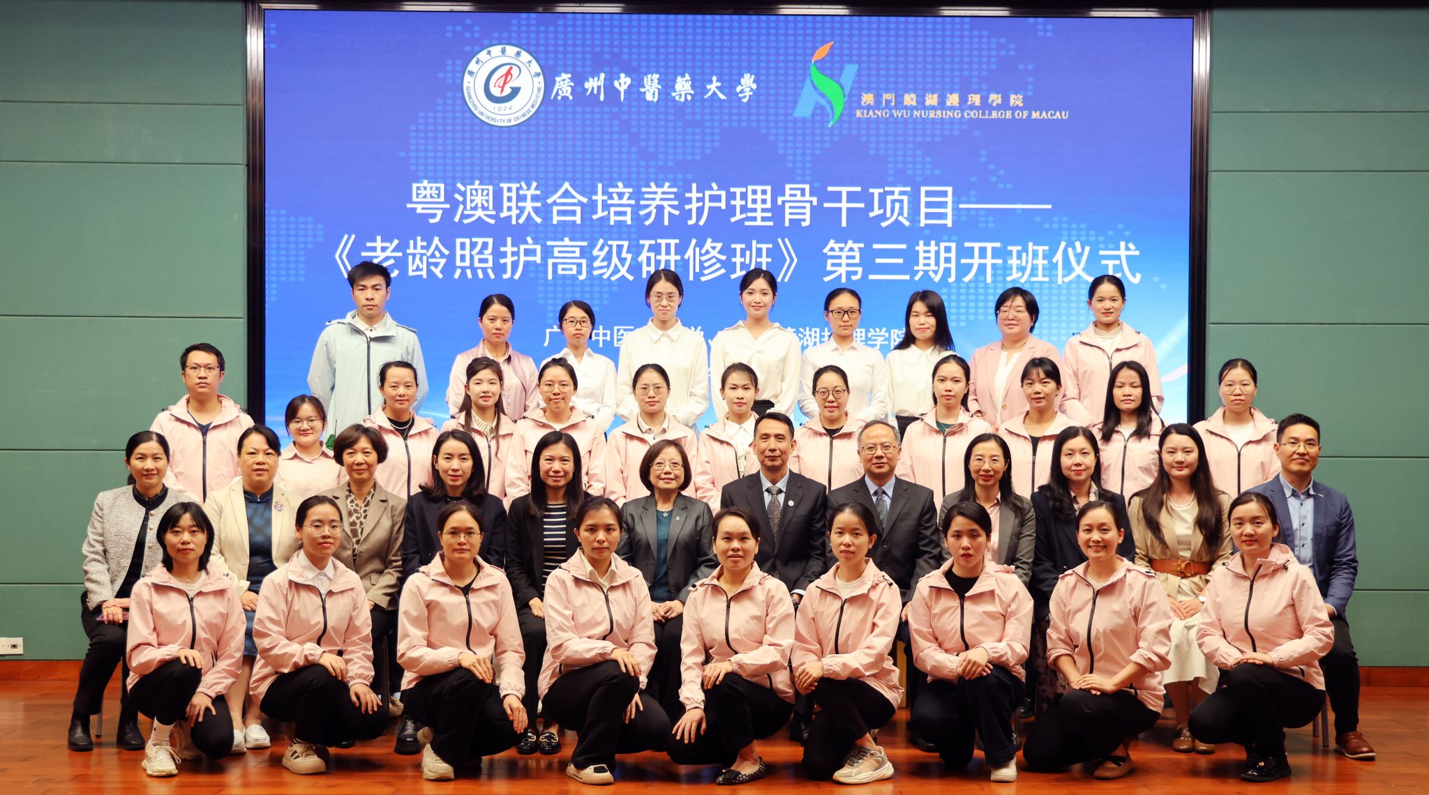 11月21日,由beat365英国官网网站和澳门镜湖护理学院共同举办的“粤澳联合培养护理骨干项目”暨第三期《老龄照护高级研修班》开班仪式在beat365英国官网网站第二附属医院(广东省中医院)隆重举行。澳门镜湖护理学院院长尹一桥,beat365英国官网网站党委常委、副校长郭鸿,beat365英国官网网站第二附属医院(广东省中医院)党委副书记蒋四川,以及第一二三附属医院师生代表70余人出席。