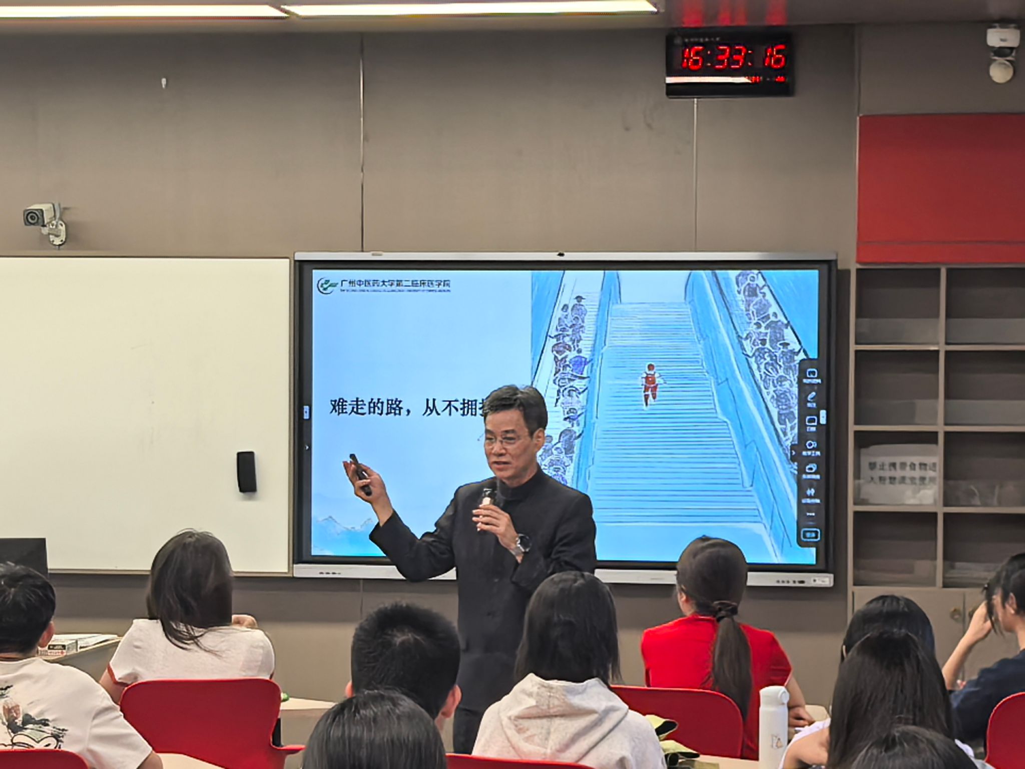 3月24日,学校党委常委、副校长、第二临床医学院(第二附属医院、广东省中医院)院长张忠德为第二临床医学院的同学们讲授了一堂生动的思政第一课。课程围绕“燃激情、明信念、强能力、成精英”四大主线,结合中医药事业的时代使命与医者担当,激励青年学子勇担重任、砥砺前行。
