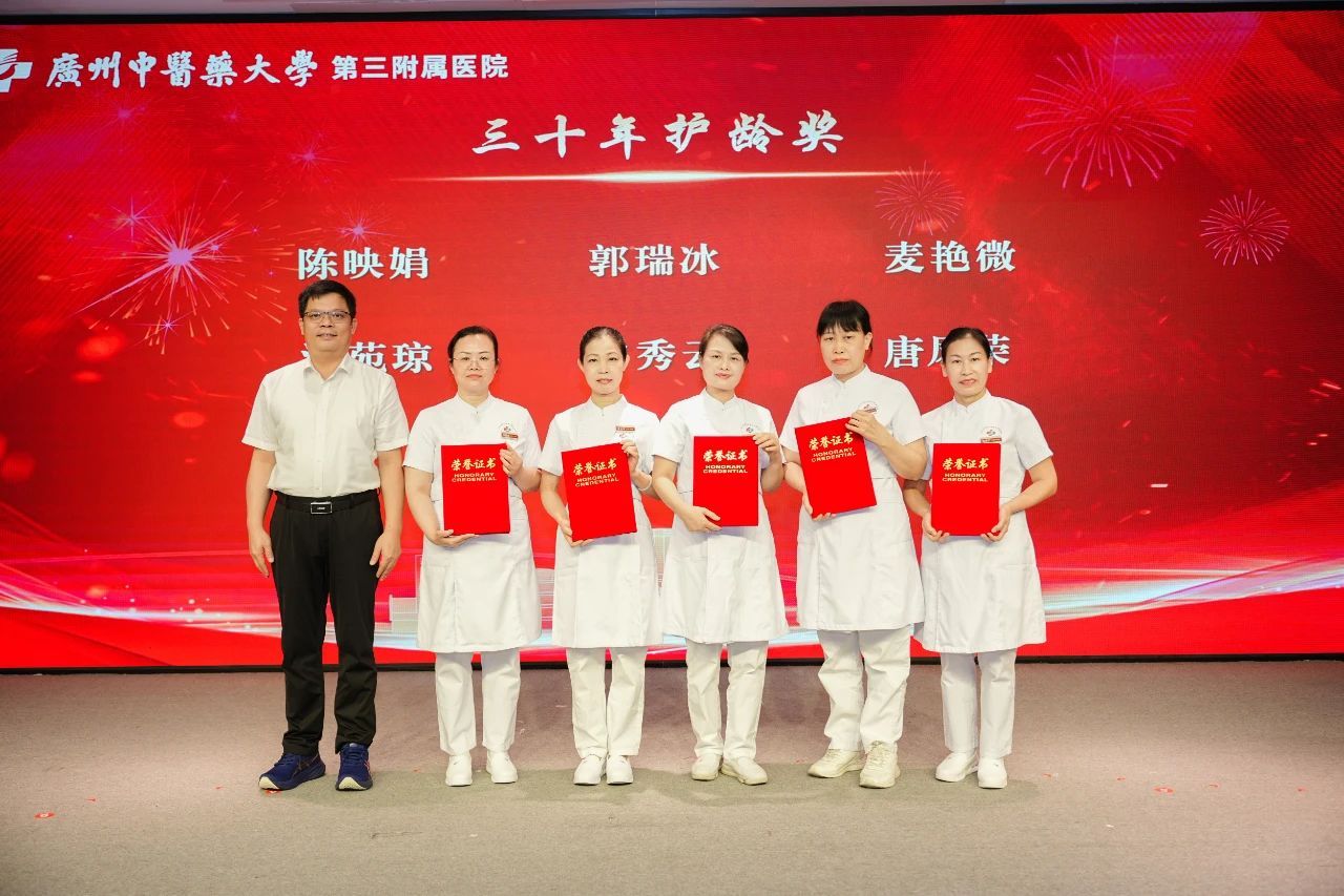 广东省中医药局副局长柯忠,beat365英国官网网站党委副书记邱亚洪,广东省岭南南丁格尔护理研究院副院长李彩红,广州市医药职业学校中医药系主任高妮,第三附属医院领导班子成员、中层干部代表、全体护士长及受表彰的护理代表齐聚一堂,共同致敬白衣天使。