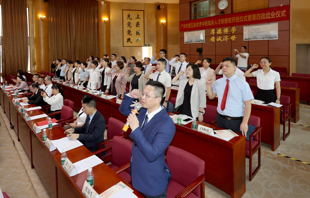 仪式上,广州市卫生健康委员会中医药处处长钟首斌宣读了第四批学员结业名单,50名学员顺利通过考核,为四年的研修生涯画上圆满句号。第五批学员以铿锵誓言开启了传承岐黄的新征程,展现了新一代中医人传承创新的坚定决心。结业学员分享成长感悟,新学员畅谈未来期许,导师代表则深情寄语,共同勾勒出中医药事业薪火相传、生生不息的美好图景。