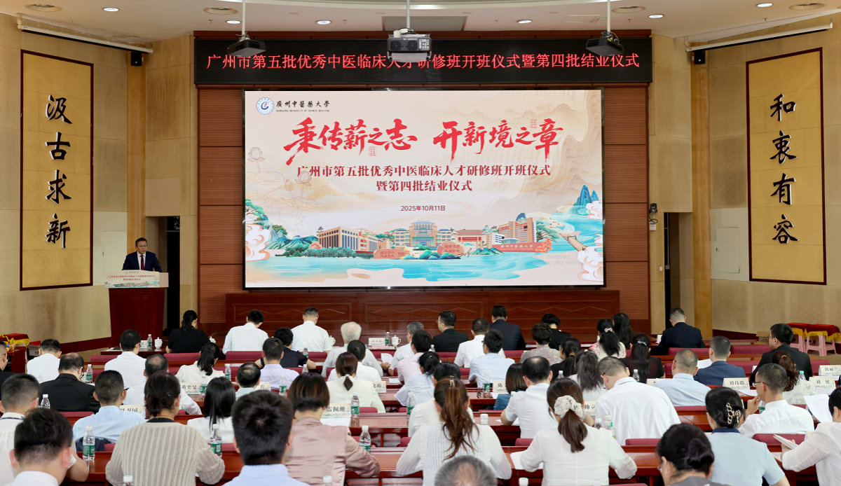 10月11日下午,广州市第五批优秀中医临床人才研修班开班仪式暨第四批结业仪式在大学城校区办公楼201学术报告厅举行。活动以“秉传薪之志,开新境之章”为主题,标志着广州市优秀中医临床人才培养工作顺利完成新一轮接力。广州市卫生健康委员会党组成员、二级巡视员胡文魁,beat365英国官网网站党委常委、副校长杨荣源,以及导师代表、第四批和第五批学员等80余人参加。