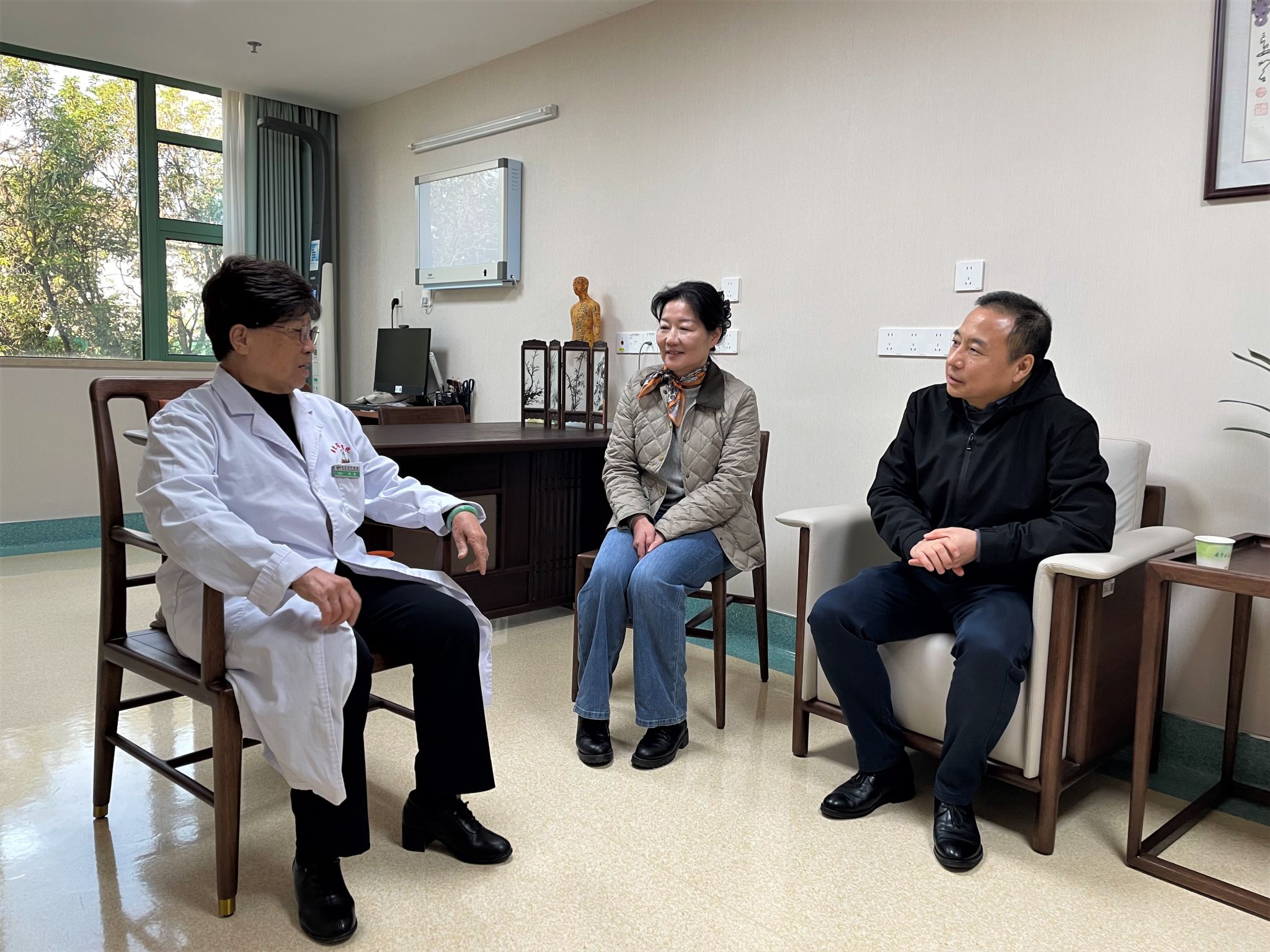 上午,林健副主席一行来到beat365英国官网网站第二附属医院(广东省中医院)二沙岛医院,在诊室看望了林毅国医大师。林健副主席详细询问其工作与生活近况,对她多年来深耕临床、教书育人、传承创新中医药事业所取得的卓越成就表示高度赞赏,并代表省侨联送上满载祝福的花束与果篮。学校侨联代表大学党委向林毅赠送慰问金,表达学校对其长期贡献的衷心感谢。林毅对省侨联和学校的关怀表示感激,并表示将继续坚守岗位,为患者健康和中医药事业发展贡献力量。第二附属医院(广东省中医院)副院长陈海陪同慰问。