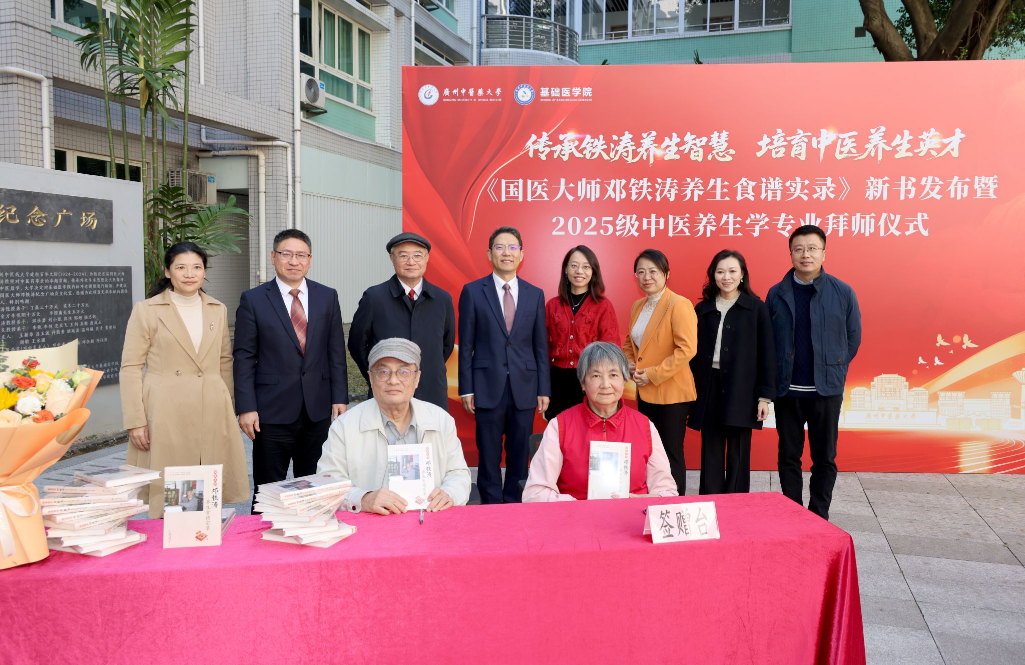 2026年1月11日下午,《国医大师邓铁涛养生食谱实录》新书发布暨2025级中医养生学专业拜师仪式在基础医学院邓老广场举行。活动以“传承铁涛养生智慧,培育中医养生英才”为主题,学校领导、邓老亲属及弟子代表、师生代表和社会各界同仁齐聚一堂,共同见证这一兼具学术深度、人文温度与时代高度的中医药传承盛事。活动由基础医学院党委书记单丽囡主持。