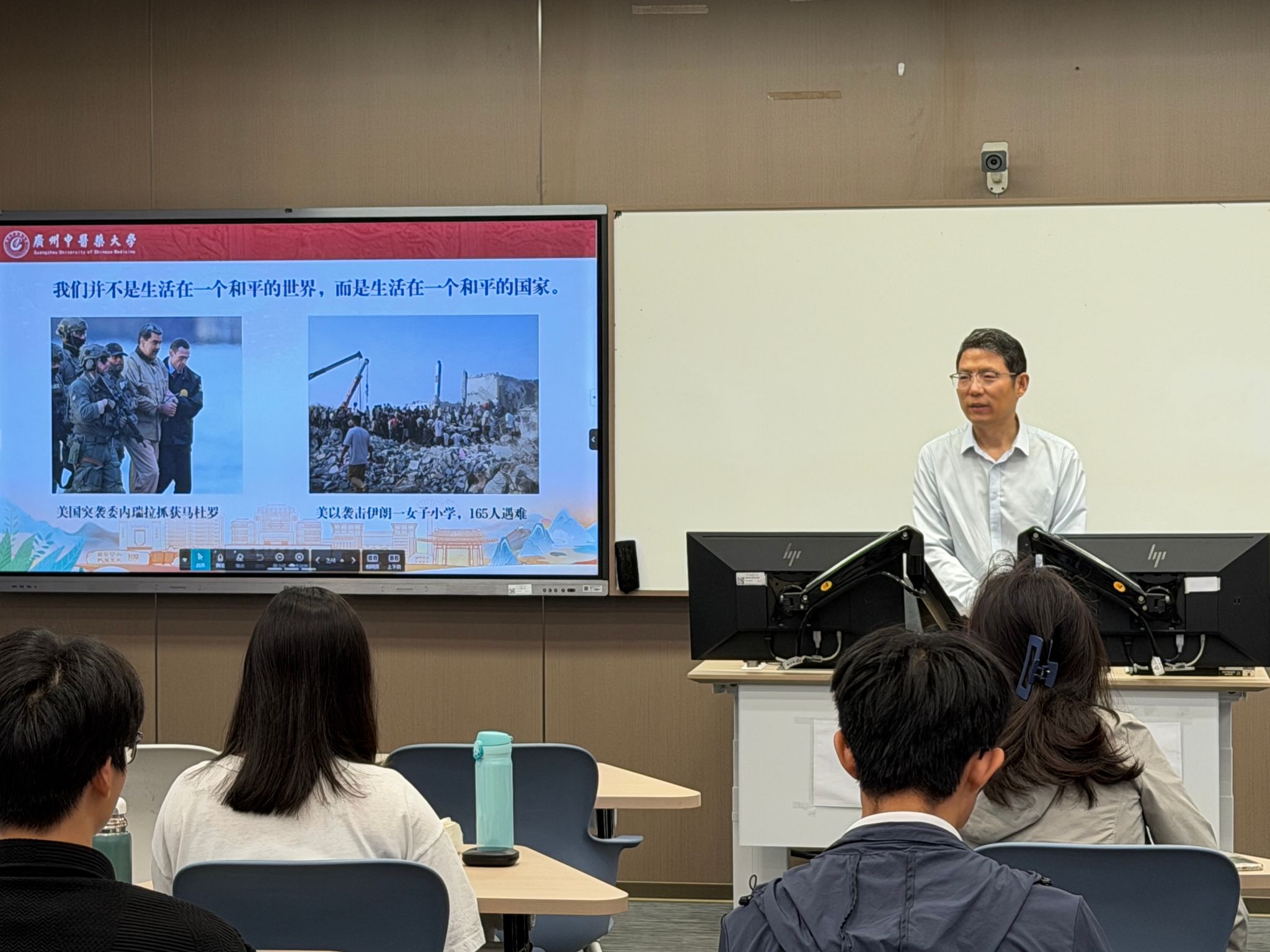 3月26日上午,学校党委常委、副校长史亚飞以《从国际热点看国家安全——新时代大学生的忧患意识与奋斗精神》为题,在教学楼B203智慧课室为2025级中医学(九年制)的同学讲授思政第一课。