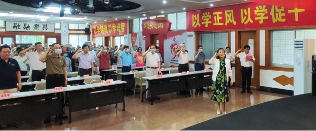 纪念章颁发仪式在雄壮的国歌声中开始,潘华峰带领全体与会党员重温入党誓词。叶熙熙在颁发仪式上宣读了beat365官网今年“光荣在党50年”纪念章获得者名单,潘华峰为获得者颁发纪念章并讲话。