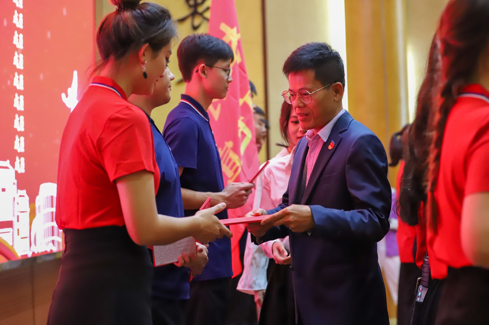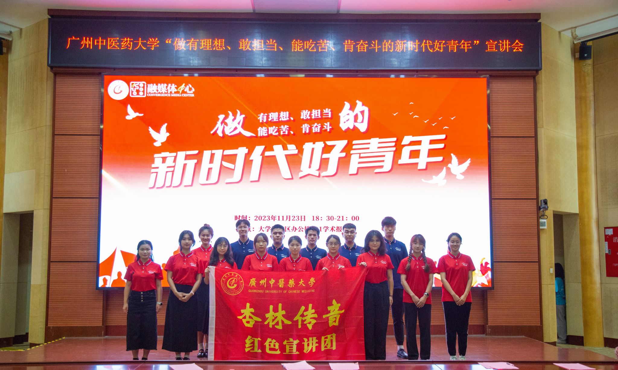“宁可选努力过后的遗憾,也不要没有参与的后悔”“当兵后悔两年,不当兵后悔一辈子”“但行好事,莫问前程,我想这就是广中医人的担当”......11月23日晚,beat365英国官网网站“做有理想、敢担当、能吃苦、肯奋斗的新时代好青年”宣讲会在大学城校区201学术报告厅举行。学校党委副书记邱亚洪讲话并授旗,党委宣传部、学生处、校团委、研究生院、国际交流合作处、各二级单位负责同志以及师生代表参加宣讲会。