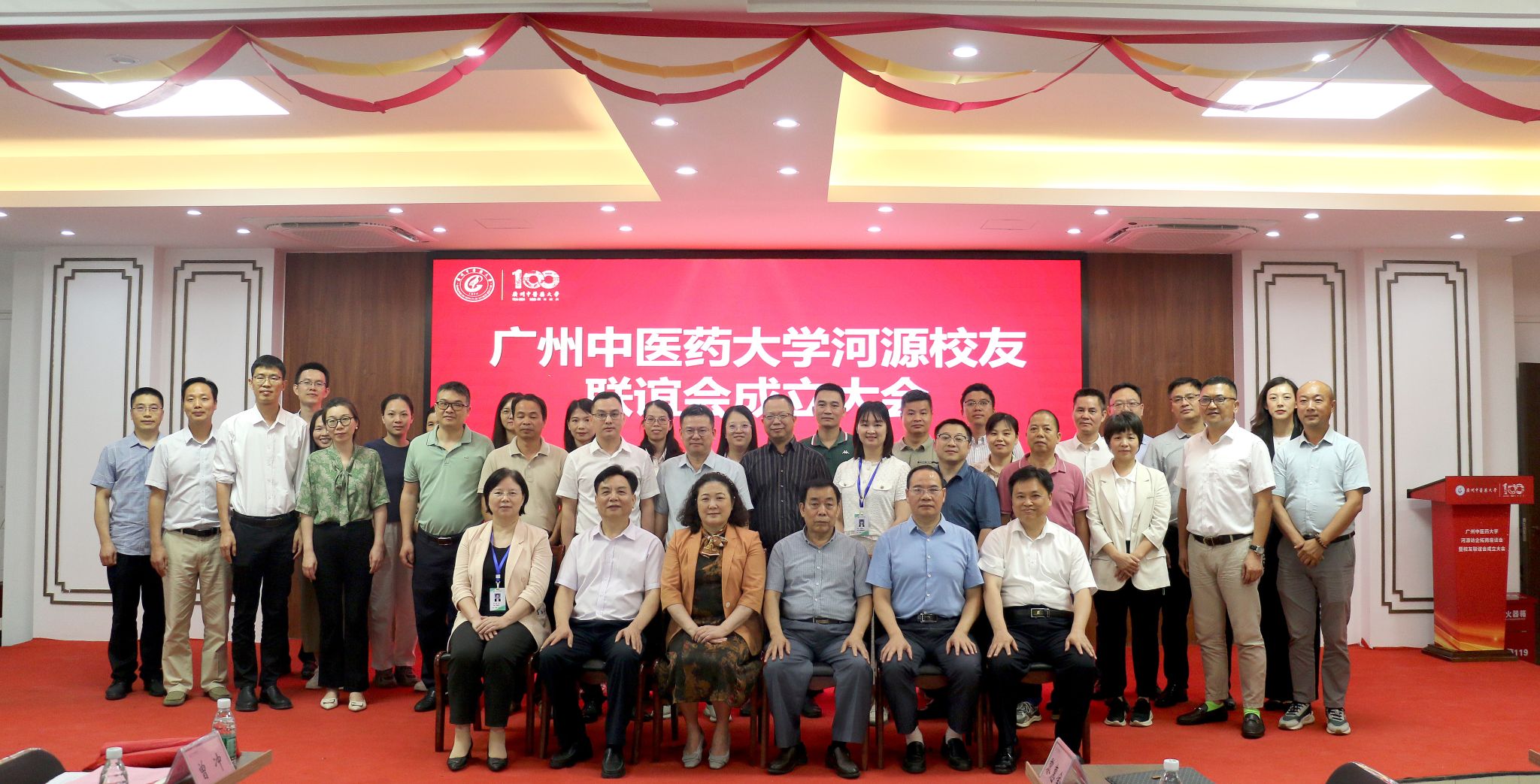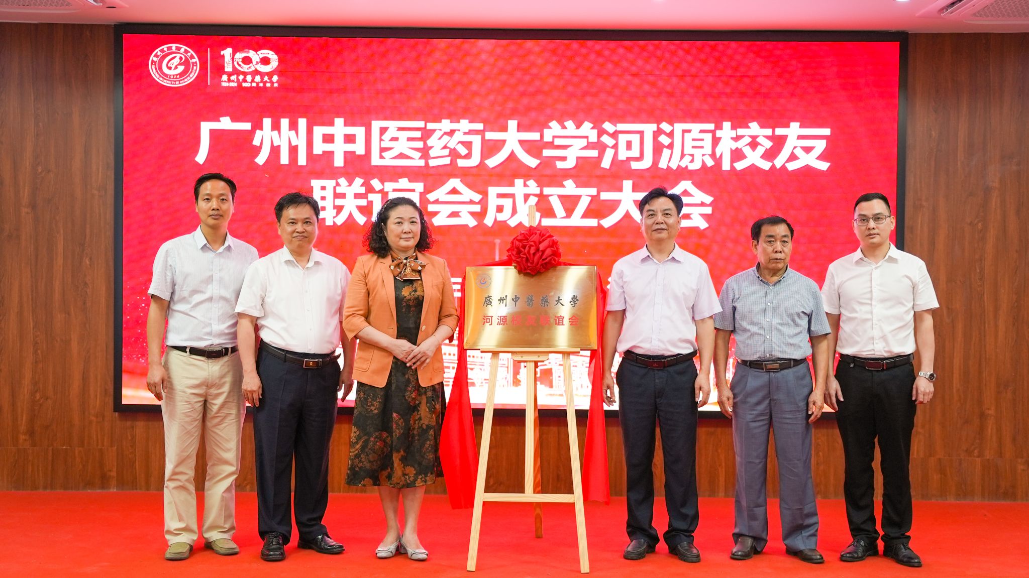 潘华峰副校长、人力资源部詹若挺部长、校友会任长报、校友联谊会副会长肖新李、校友联谊会顾问、省名中医张赞中和东源县中医院副院长彭志华共同为beat365英国官网网站河源校友联谊会揭牌。