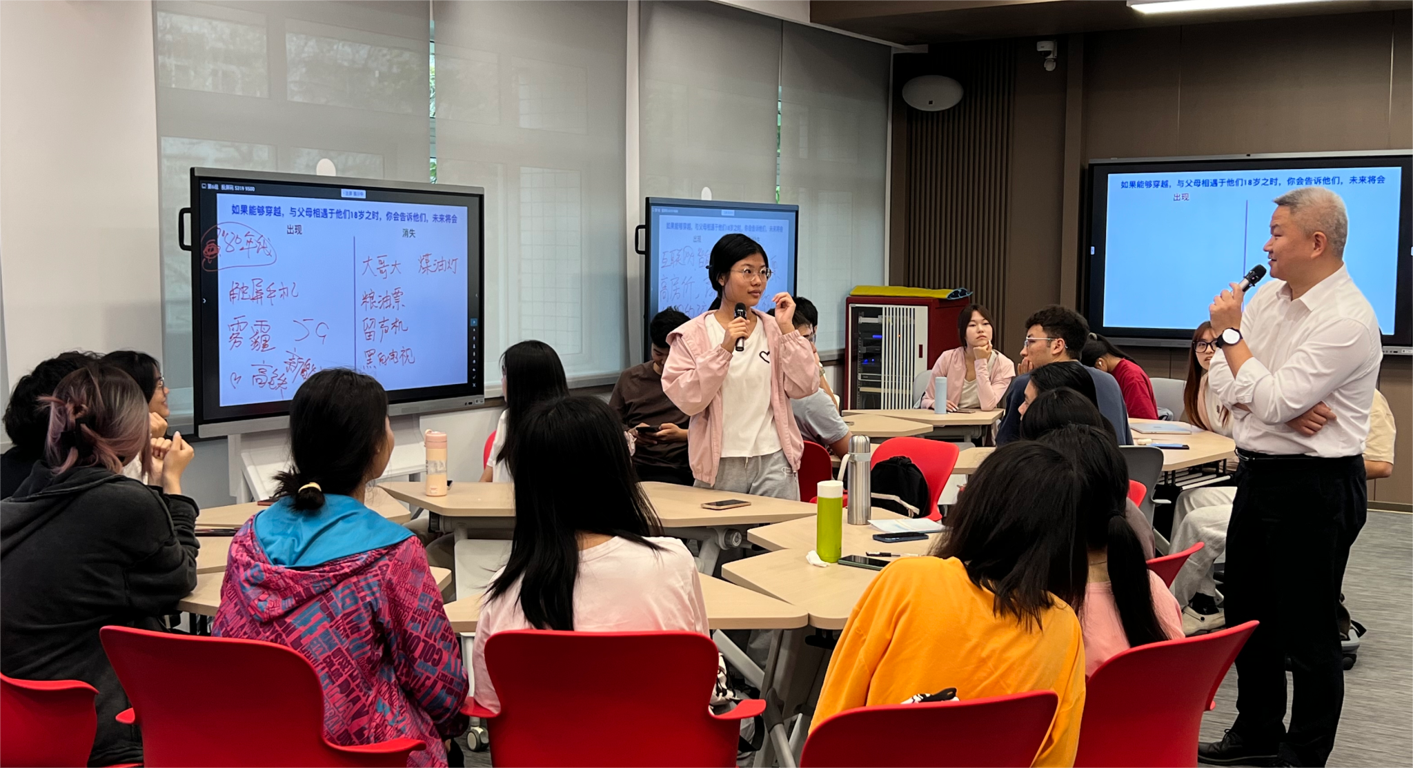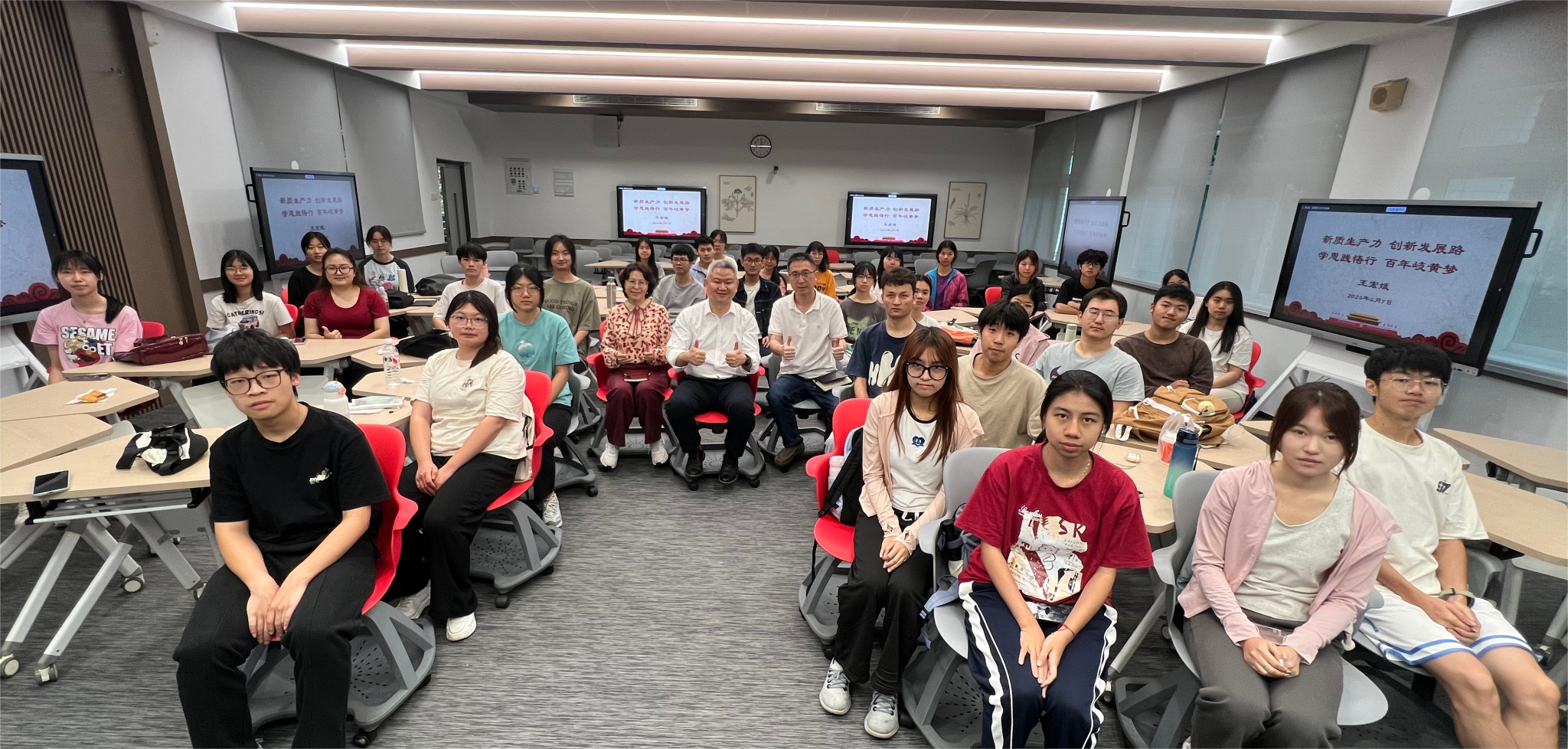 王宏斌从现场同学们最关注的关键词“新质生产力”切入,通过两场“时光穿越”式的漫想,让同学们回顾和畅想20年前及20年后生活方式的变化,继而从“发展-破局-博弈”三部分总结过去的发展经验,使同学们能切身体会到新质生产力对我们现实生活各方面的影响,更好地理解“创新”在发展新质生产力中的必要性和重要性;同时结合全国两会、广东省高质量发展大会等会议精神,激发同学们思考大学生在发展新质生产力中应主动承担的角色和任务。