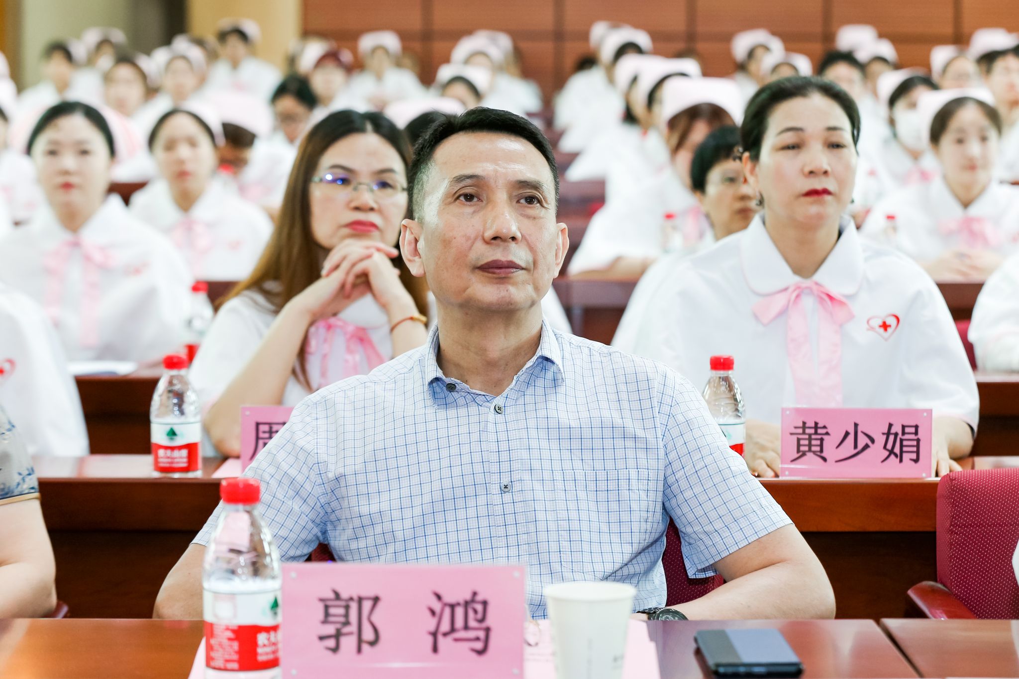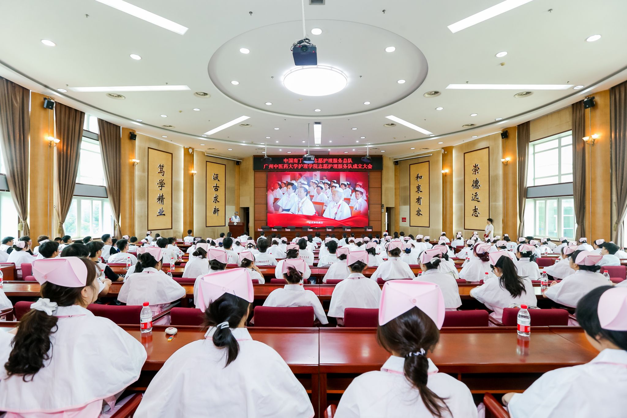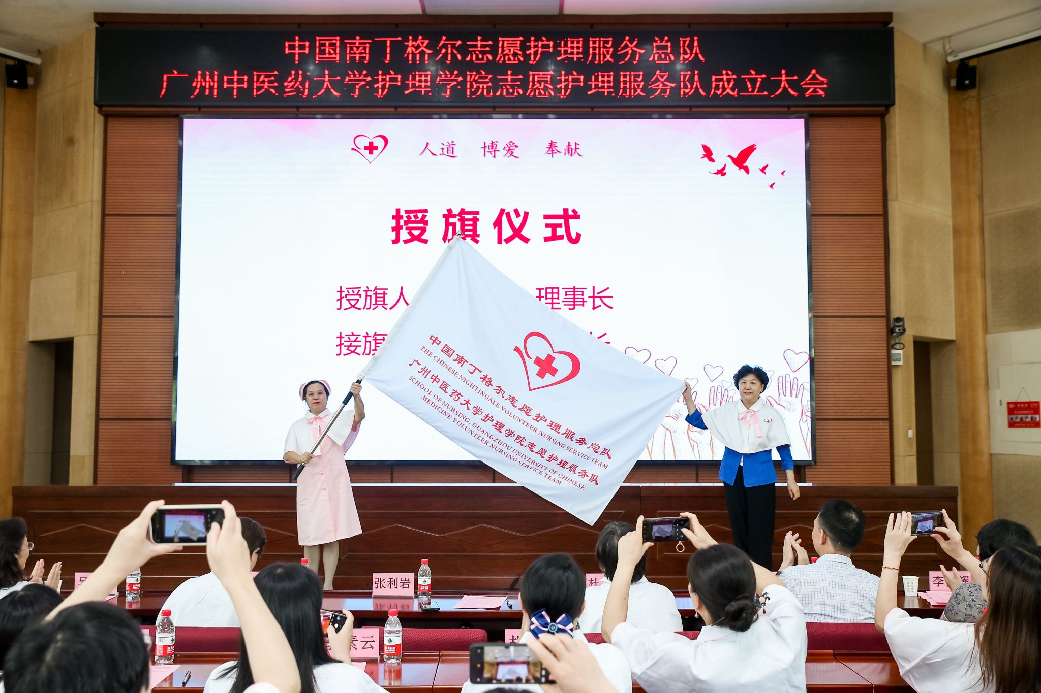 第43届南丁格尔奖荣获者、中国南丁格尔志愿护理服务总队理事长张利岩、副理事长成守珍、副理事长杜丽群、副秘书长吴惠平,学校党委常委、副校长郭鸿,广东省卫生健康委员会二级调研员李俐辉,广州市红十字会副会长姜华等领导,以及广东省各医疗单位代表、beat365英国官网网站志愿者代表约200人参加。