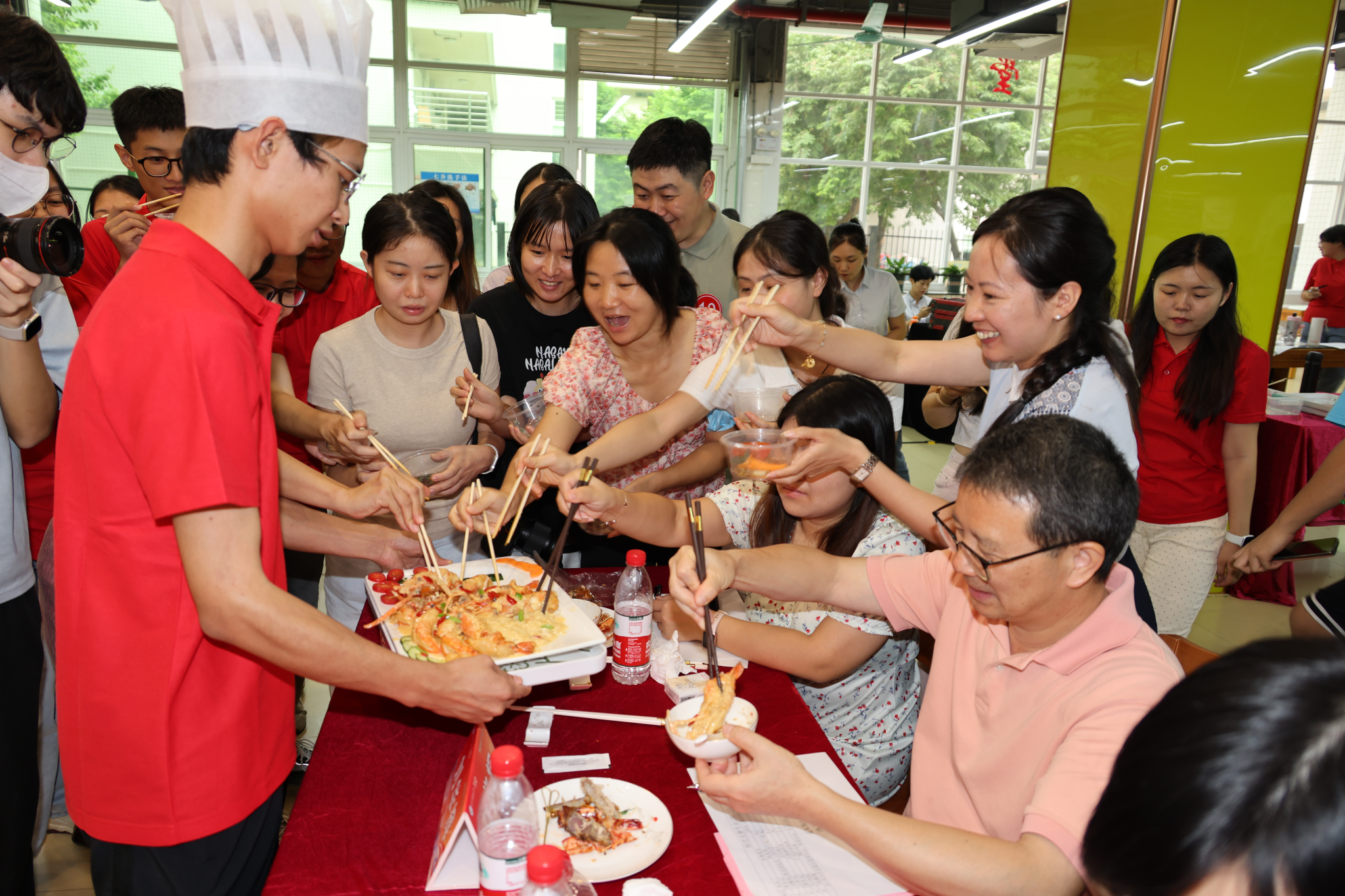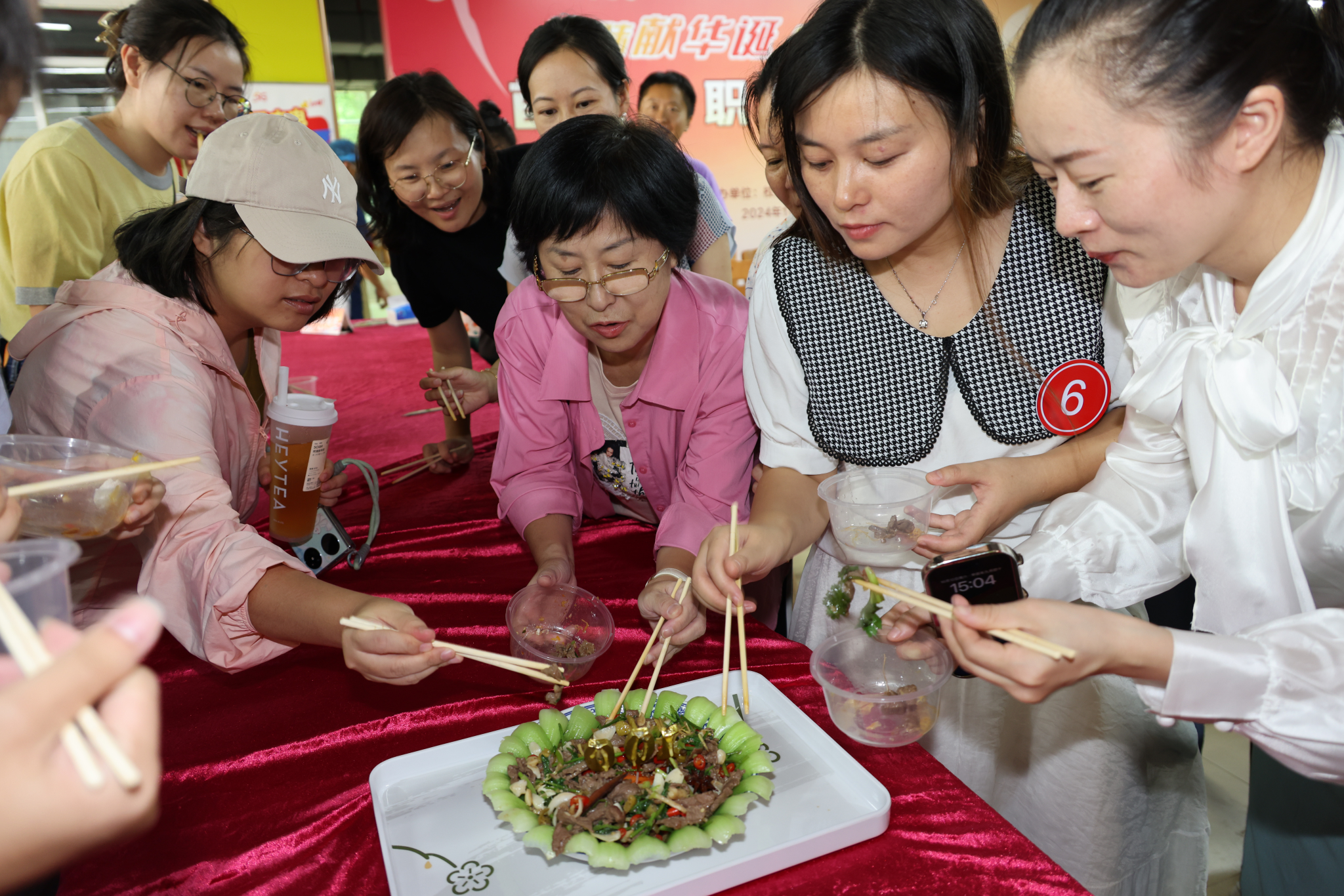 10月12日下午,由校工会和总务后勤部联合举办的“美味献华诞 色香贺百年”首届教职工厨艺大赛在beat365官网大学城校区第二食堂一楼进行。学校党委常委、副校长、校工会主席郭鸿,校工会常务副主席郝宏伟、副主席刘瑜、总务后勤部副部长廖文萍,部分二级工会主席以及150多位师生观众参与活动。