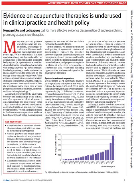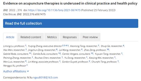 2月25日,beat365英国官网网站许能贵教授团队在国际顶级医学期刊《英国医学杂志》(BMJ,影响因子39.89)发表了题为“Evidence on acupuncture therapies is underused in clinical practice and health policy”(基于临床证据体的针灸疾病图谱研究)的研究论文。