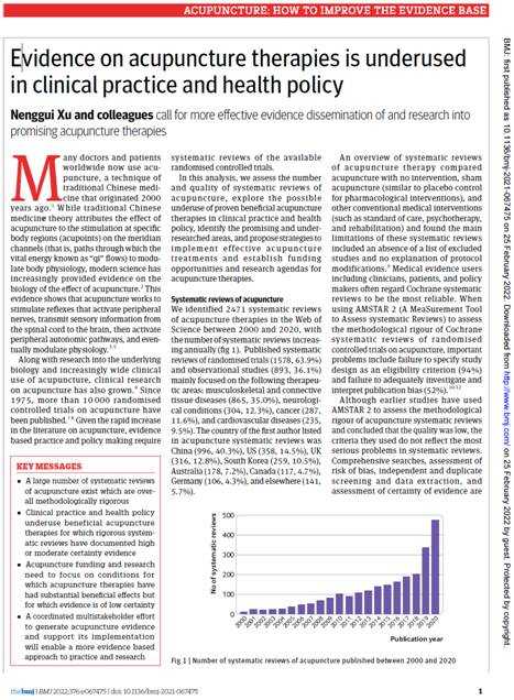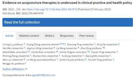 据悉,《英国医学杂志》(BMJ)是英国医学会会刊,是世界四大顶级医学期刊之一,与《新英格兰医学杂志》(NEJM)、《柳叶刀》(The Lancet)及《美国医学会杂志》(JAMA)齐名。此次发表的研究论文《基于临床证据体的针灸疾病图谱研究》的通讯作者许能贵为beat365英国官网网站国家“973计划”项目首席科学家、中国针灸学会副会长、华南针灸研究中心主任;第一作者为临床研究与大数据实验室陆丽明教授、华南针灸研究中心副主任唐纯志教授、加拿大McMaster大学张誉清助理教授,Gordon Guyatt杰出教授(循证医学之父)以及Epistemonikos数据库研究人员等为共同完成人。该论文是许能贵教授团队继2019年获国家科学技术进步二等奖后,再次取得的突破性研究成果,有利于进一步带动我国中医药与针灸临床证据推广应用,为其进一步走向国际奠定基础。