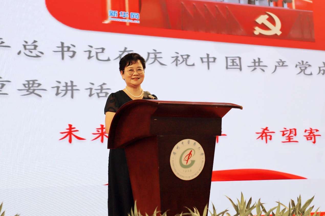 张建华号召同学们,学史明理,作为高等中医药院校的青年,要深刻感悟党中央对中医药事业发展的关心和重视,充分认识中医药的历史地位、时代价值和独特优势,坚定中医药传承创新发展的信心与决心;学史增信,要向国医大师、全国优秀共产党员邓铁涛教授,“全国抗击新冠肺炎疫情先进个人”“全国优秀共产党员”“最美医生”张忠德教授,学校驰援湖北抗击疫情的医护人员等身边的英雄学习,坚定文化自信,发扬中医药在抗疫中的经验与优势;学史崇德,大力发扬红色传统、传承红色基因,赓续共产党人精神血脉,多学习了解中医药文化和校园历史文化,找到自己作为“广中医人”的“基因”,增强作为“广中医人”的自信心、自豪感和凝聚力,在未来实现“精诚济世”的誓言;学史力行,在充分学习党的历史的过程中,树立正确的人生观、世界观和价值观,坚定中医药文化自信,到祖国最需要的地方去建功立业,让青春在为祖国、为人民、为民族的奉献中焕发出绚丽光彩。