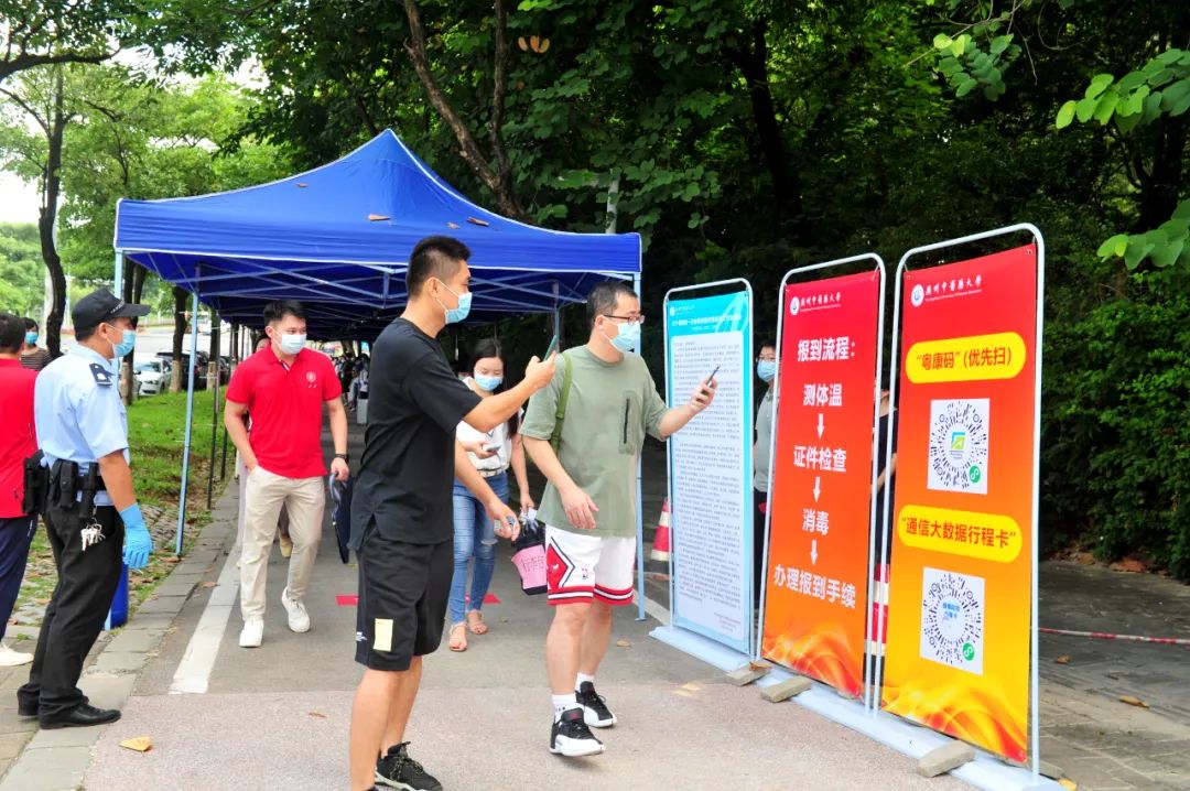 测体温、证件检查、消毒、办理报到手续,广中医在校门口设置了清晰的入校指引,参加演练的同学和工作人员根据指引入校。