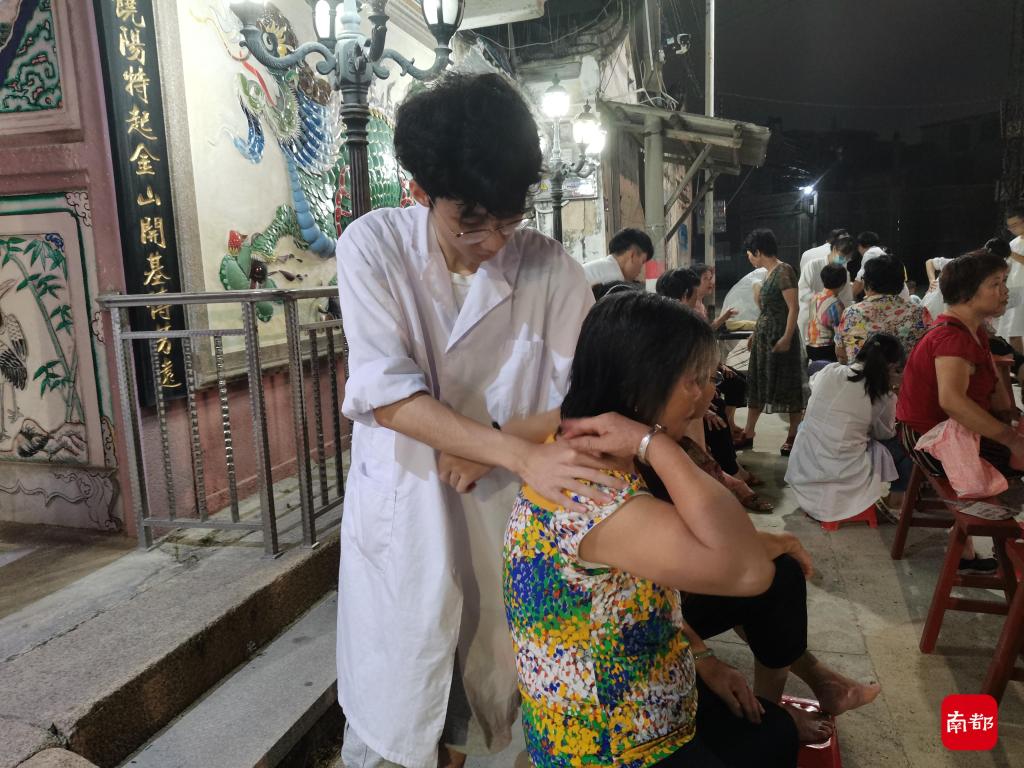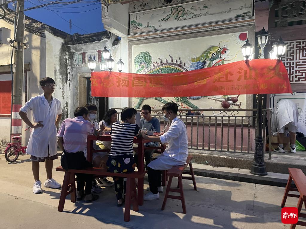 严日迅表示,三下乡的经历是非常充实忙碌的。白天小队的各个成员在村里走街串巷,为当地的村民开展医疗调研;晚上六点许,这群大学生便陆续聚集在村里的祠堂门口,从祠堂里拿出红木桌椅,安置自带的医疗服务器材,拉起广中医“汕医行”三下乡服务队的横幅,开始忙碌的义诊工作。