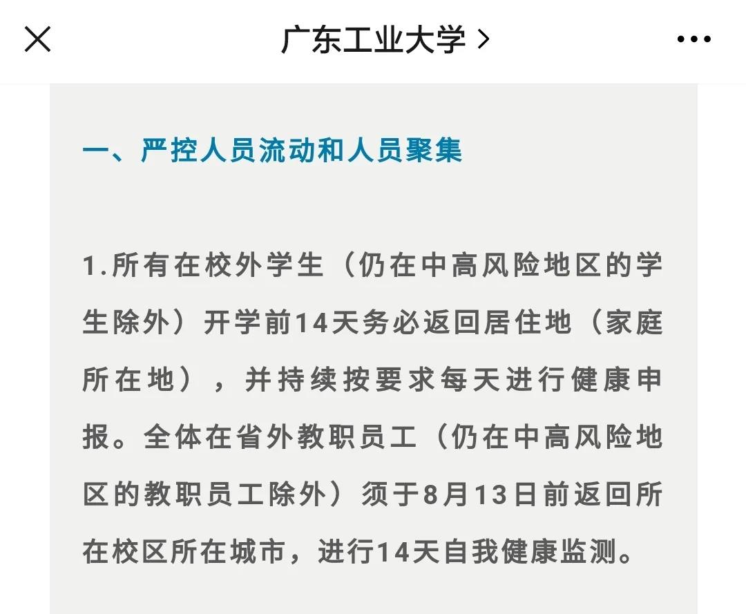 8月4日和11日,广东工业大学先后两次发布通知,所有在校外学生(仍在中高风险地区的学生除外)开学前14天务必返回居住地(家庭所在地),并持续按要求每天进行健康申报。