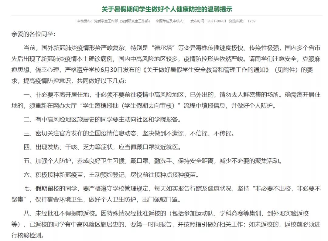 8月1日,华南农业大学发布通知,未经批准不得提前返校。因特殊情况经批准返校的(包括参加运动队、学科竞赛等集训,到外地实验返校等),已返校的同学有中高风险区旅居史的,要第一时间报告,并按照指引做好相关工作;如未返校的,返校前必须进行核酸检测。