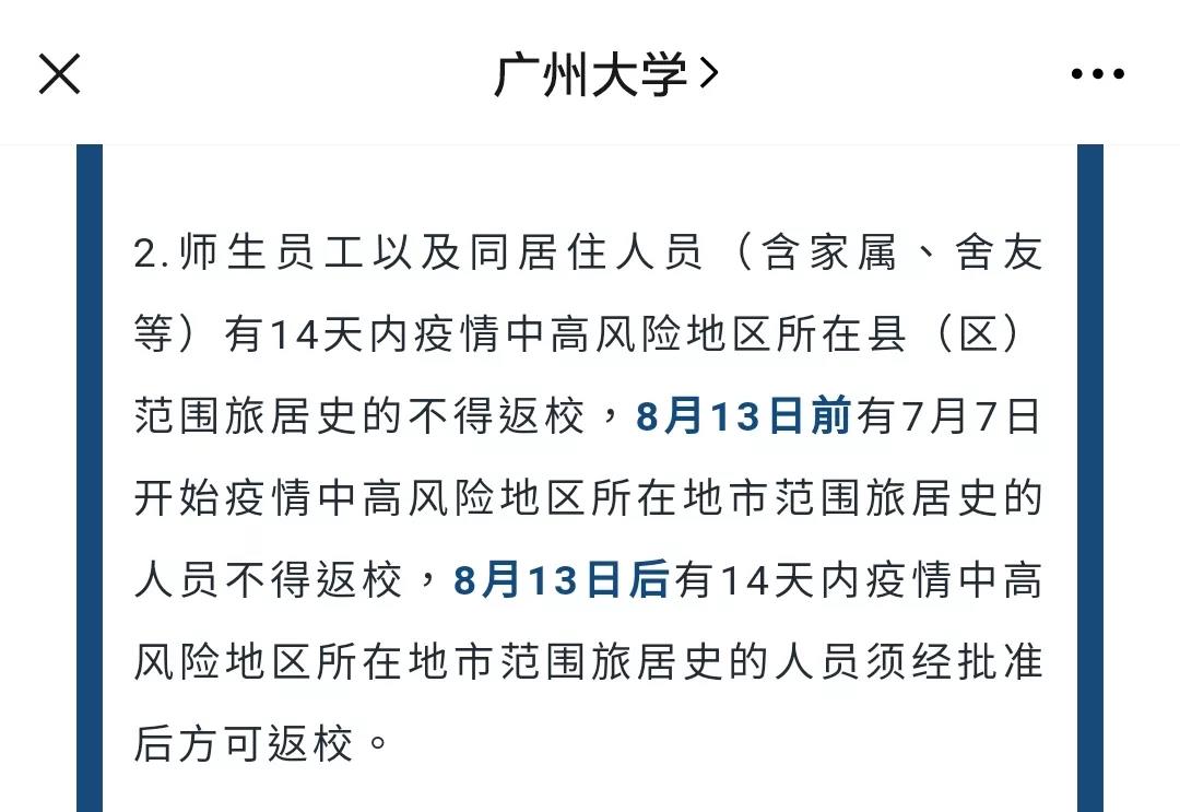 8月3日,广州大学发布通知,师生员工以及同居住人员(含家属、舍友等)有14天内疫情中高风险地区所在县(区)范围旅居史的不得返校,8月13日前,有7月7日开始疫情中高风险地区所在地市范围旅居史的人员不得返校,8月13日后,有14天内疫情中高风险地区所在地市范围旅居史的人员须经批准后方可返校。