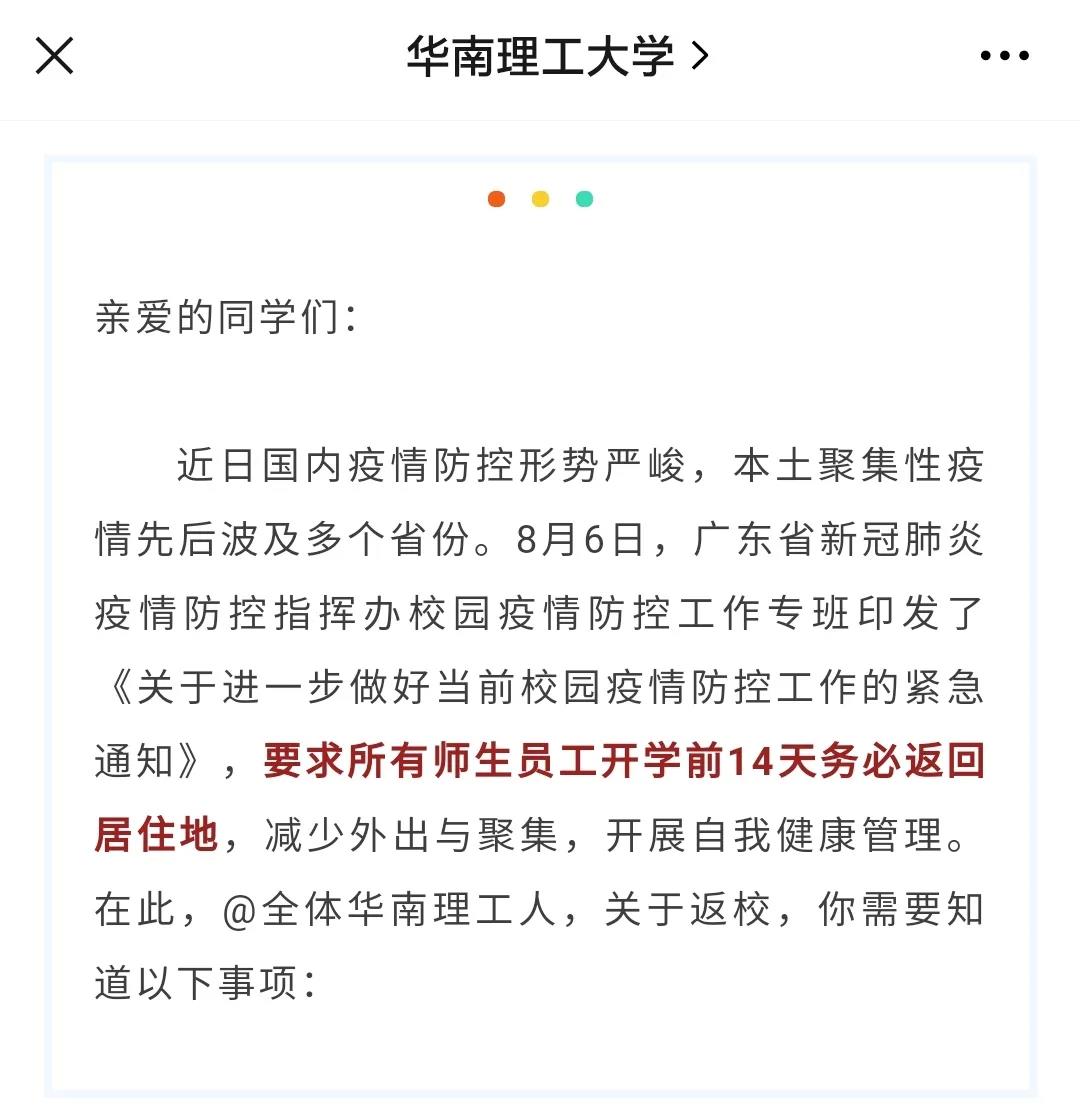 8月11日,华南理工大学发布通知,要求所有师生员工开学前14天务必返回居住地,减少外出与聚集,开展自我健康管理。学生离校后非通知不返校。确需提前返校者应提前申请(申请返校日前14天有省外行程者须提供返校前48小时核酸检测报告),经所在各院(系)及学校审批同意后方可返校。