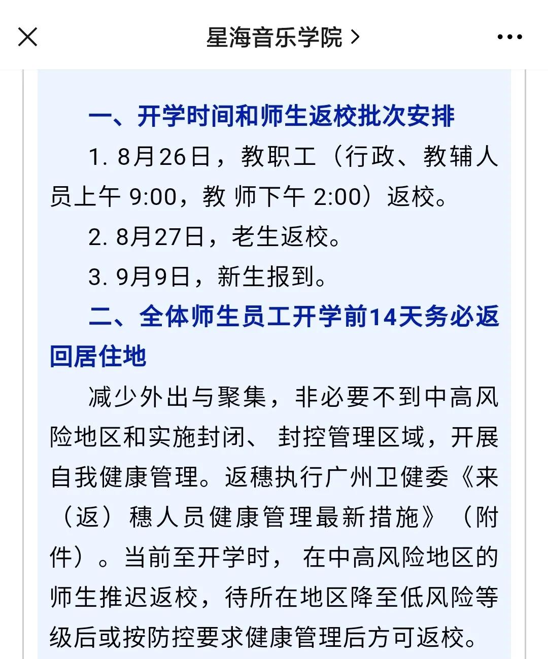 8月8日,星海音乐学院发布通知,全体师生员工开学前14天务必返回居住地,减少外出与聚集,非必要不到中高风险地区和实施封闭、 封控管理区域,开展自我健康管理。8月26日,教职工(行政、教辅人员上午 9:00,教师下午 2:00)返校;8月27日,老生返校;9月9日,新生报到。