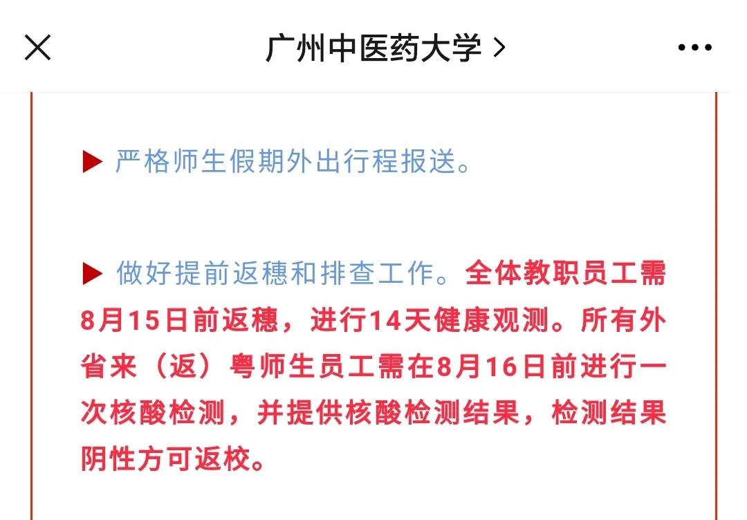 仲恺农业工程学院:所有教职工需在 8 月 13 日前返回广东居住地、在校本科生及研究生需在 8 月 13 日前、研究生新生需在 8 月 19日前、本科生新生需在 9 月 1 日前返回居住地,减少外出与聚集,返校前在居住地开展 14 日自我健康管理。