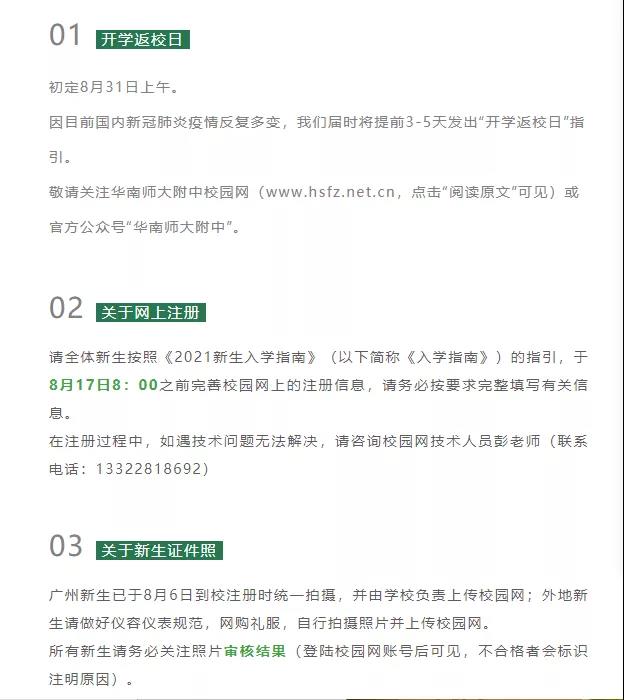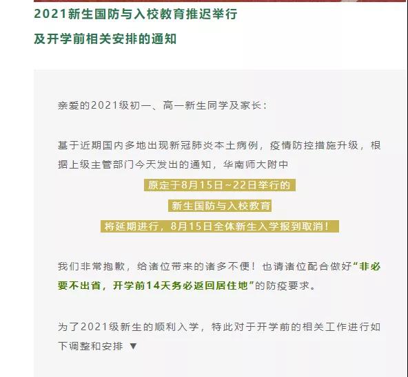 华南师大附中官微通知,原定于8月15-22日举行的新生国防与入校教育将延期进行,8月15日全体新生入学报到取消!开学返校日初定8月31日上午。因目前国内新冠肺炎疫情反复多变,届时将提前3-5天发出“开学返校日”指引。全体新生按照《2021新生入学指南》,于8月17日8:00之前完善校园网上的注册信息。
