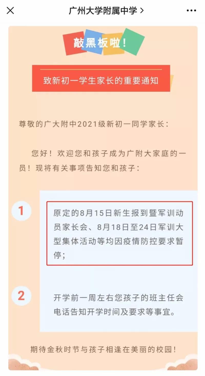 广州大学附属中学表示,原定的8月15日新初一学生报到暨军训动员家长会、8月18日至24日军训大型集体活动等均因疫情防控要求暂停。