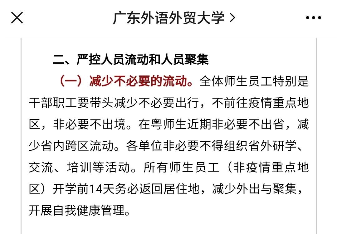 8月10日,广东外语外贸大学发布通知,所有师生员工(非疫情重点地区)开学前14天务必返回居住地,减少外出与聚集,开展自我健康管理。14天内有中高风险地区旅居史的师生员工暂缓返粤返校。