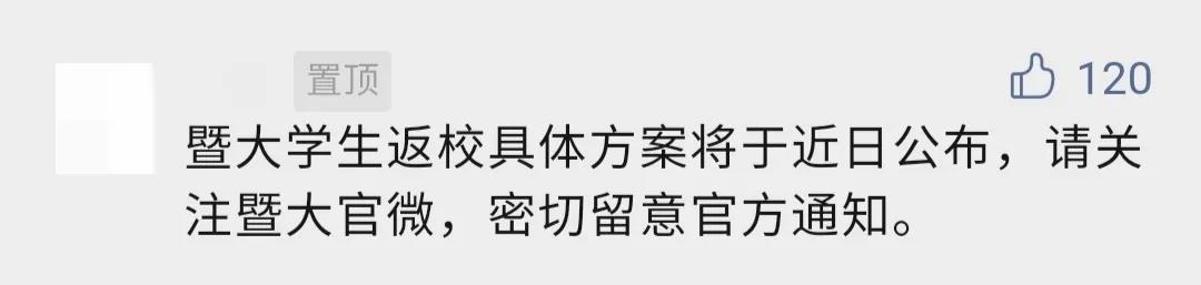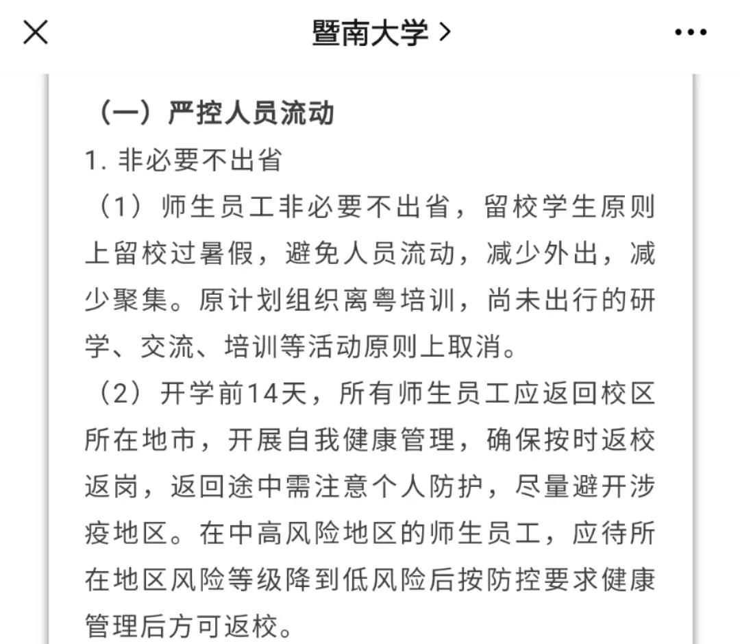 8月8日,暨南大学发布通知,开学前14天,所有师生员工应返回校区所在地市,开展自我健康管理,确保按时返校返岗,返回途中需注意个人防护,尽量避开涉疫地区。据该文章置顶留言,暨大学生返校具体方案将于近日公布。