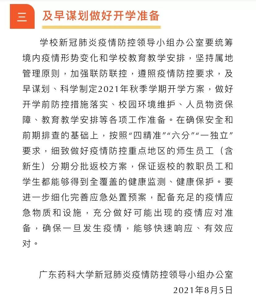 8月5日,广东药科大学发布通知,在确保安全和前期排查的基础上,按照“四精准”“六分”“一独立”要求,细致做好疫情防控重点地区的师生员工(含新生)分期分批返校方案,保证返校的教职员工和学生都能够得到全覆盖的健康监测、健康保护。